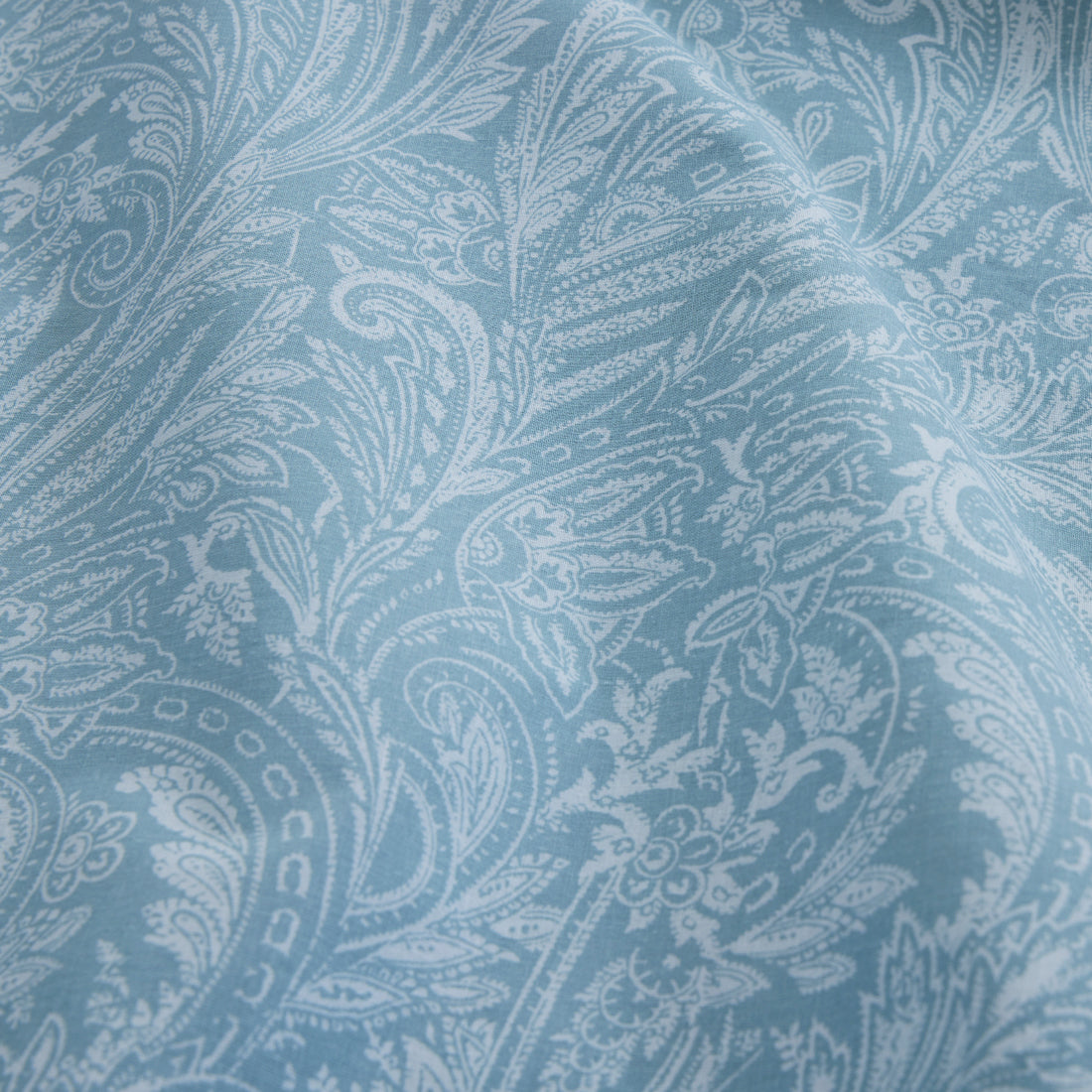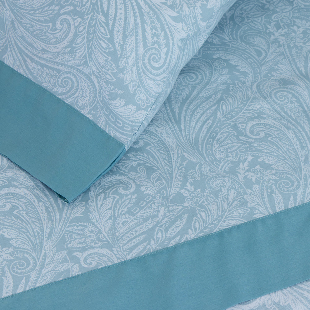 The set consists of a printed top sheet, a plain fitted bottom sheet, and a printed pillowcase with two openings.