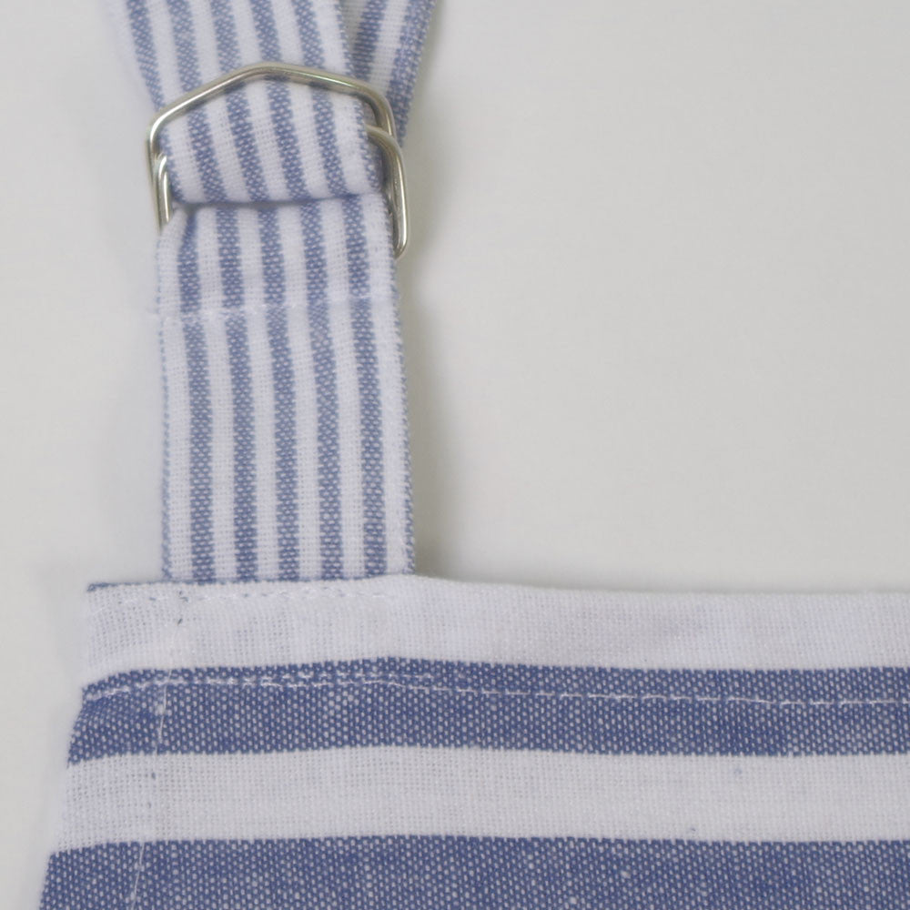 Adjustable apron with a buckle to adjust the height and a front pocket.