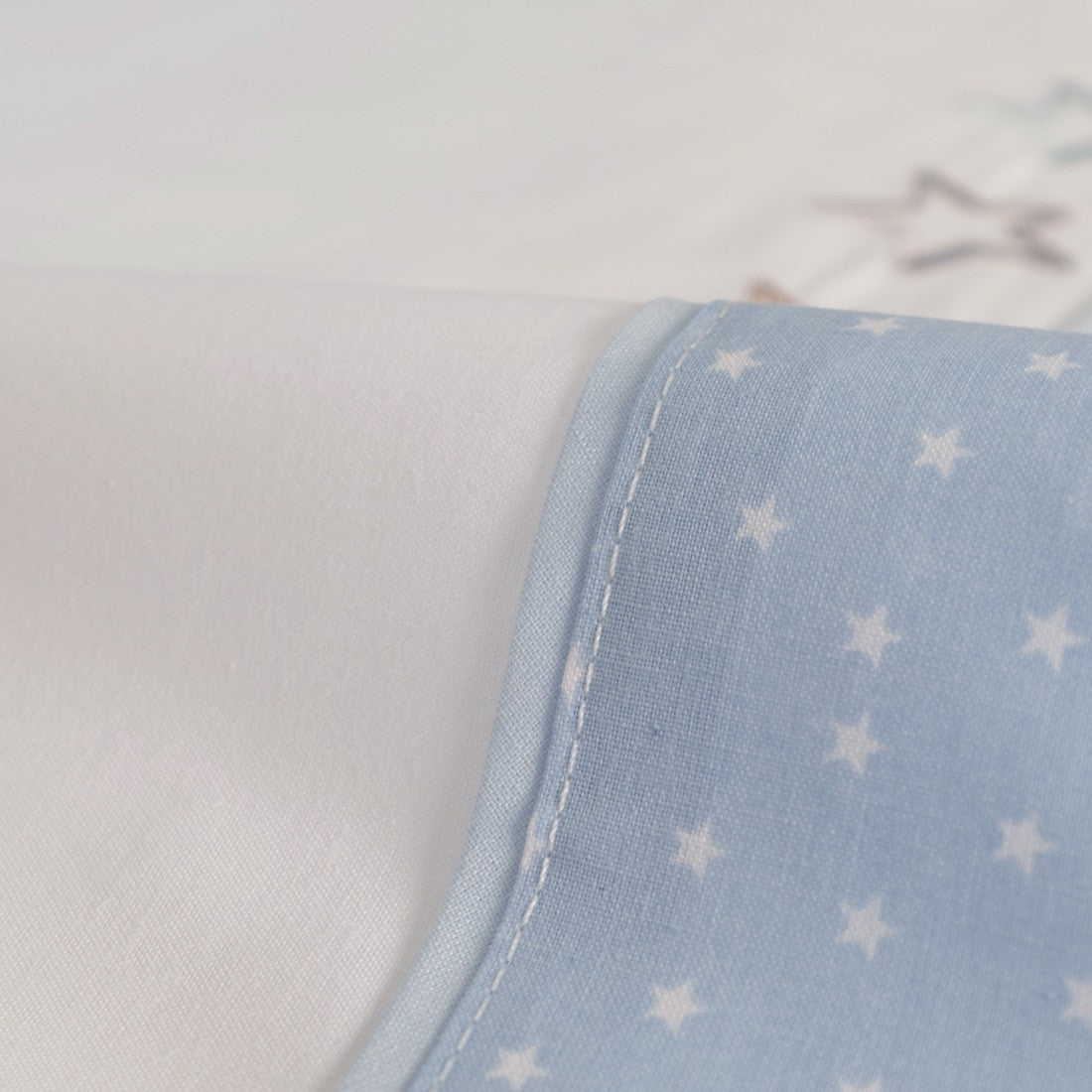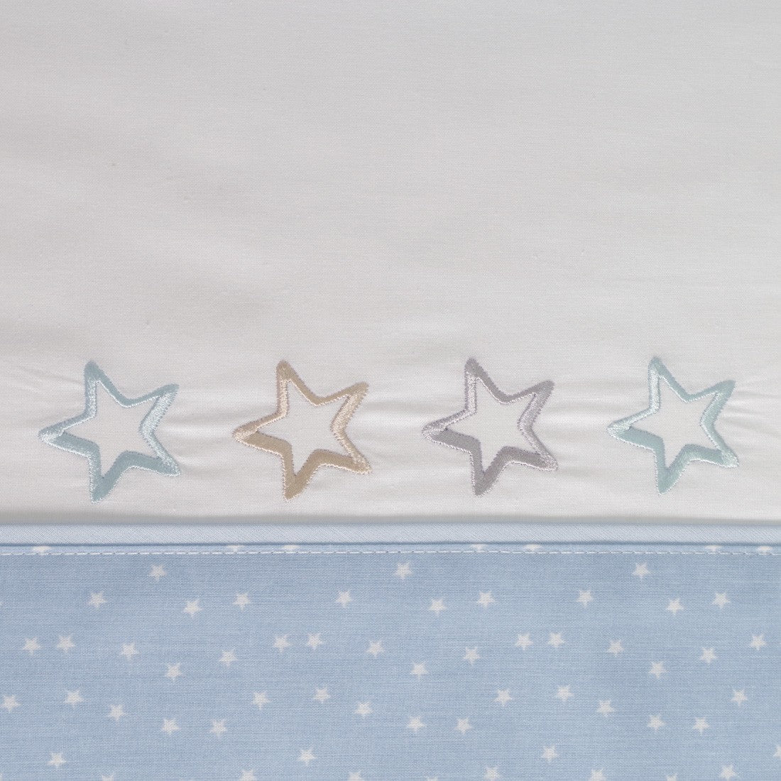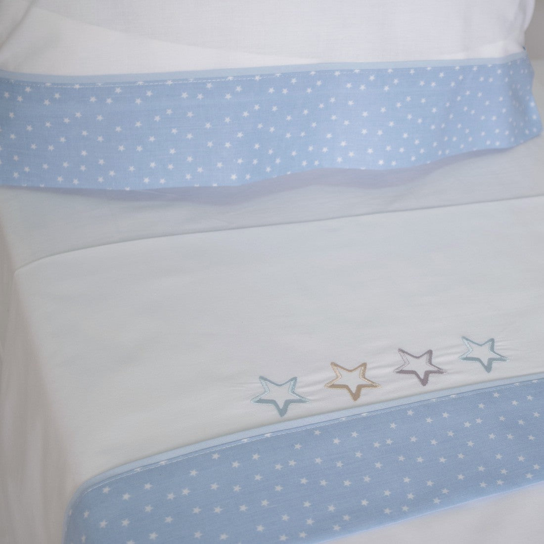 Three-piece crib set for baby made of 100% cotton with an embroidered design in the center, available in two colors, featuring a contrasting trim with printed little stars.