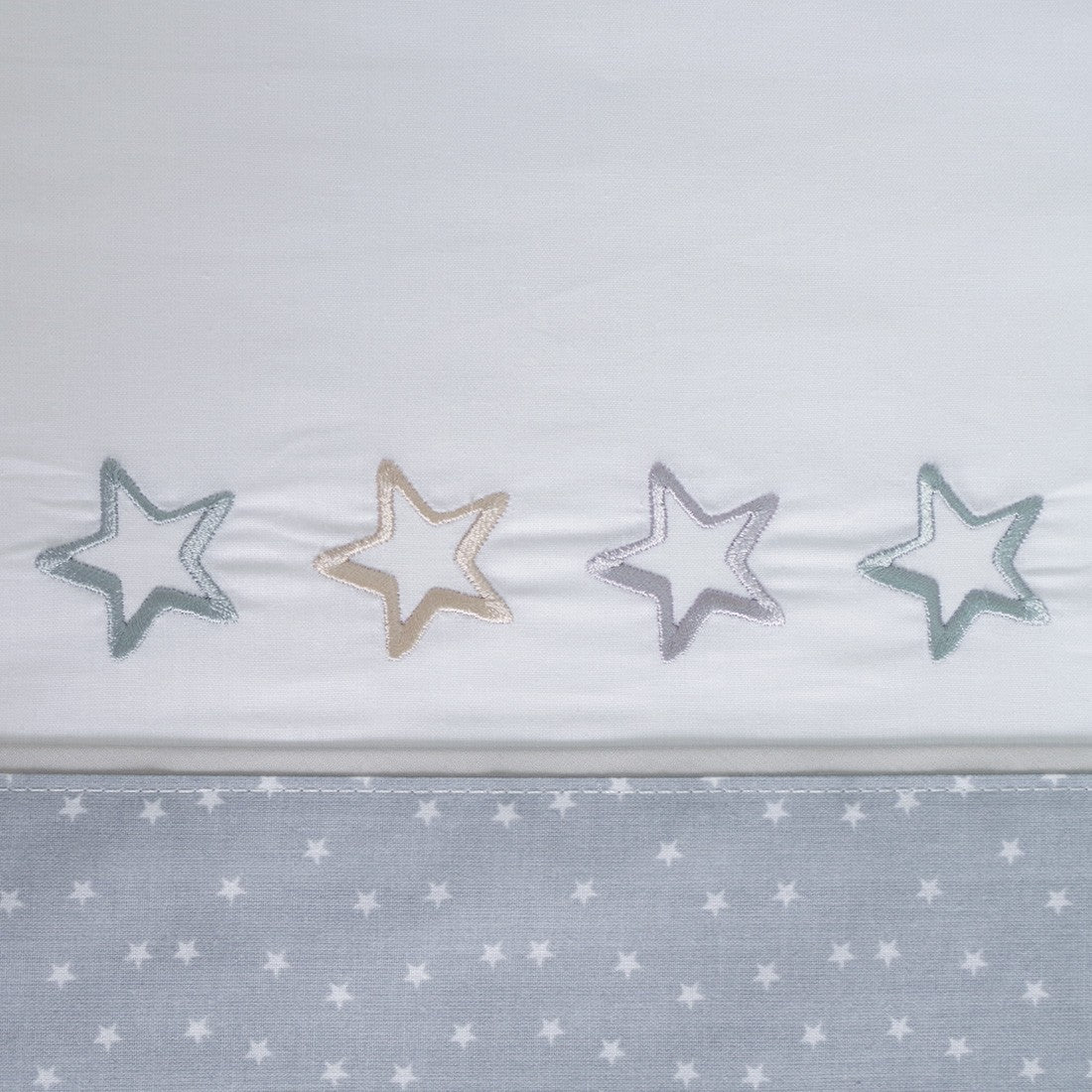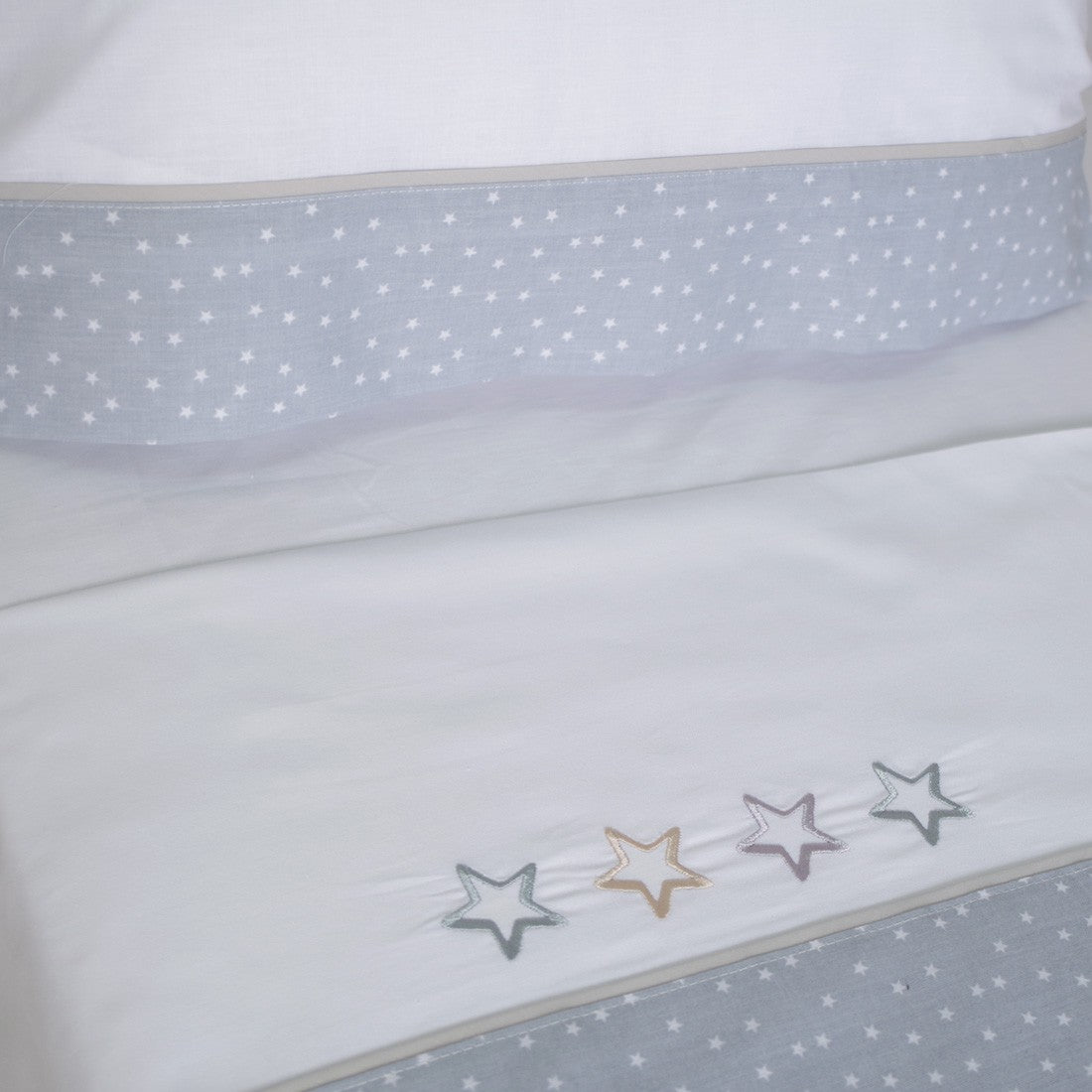 Three-piece crib set for baby made of 100% cotton with an embroidered design in the center, available in two colors, featuring a contrasting trim with printed little stars.