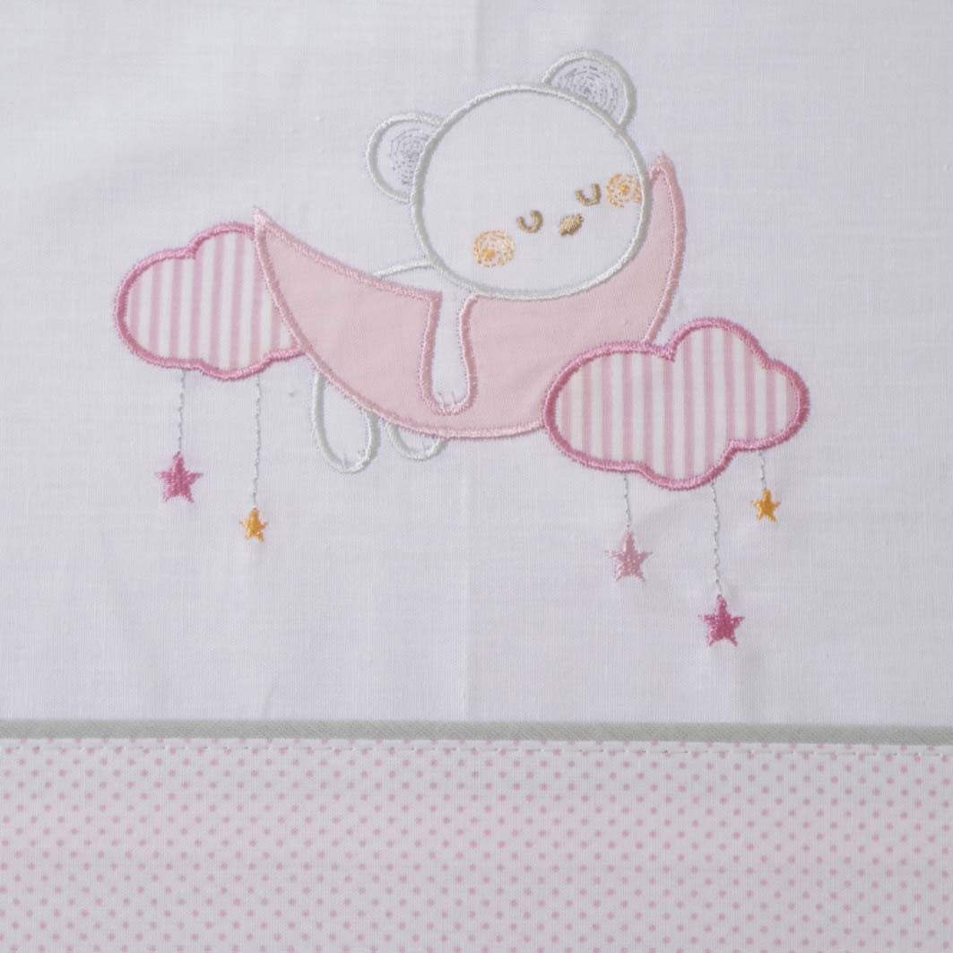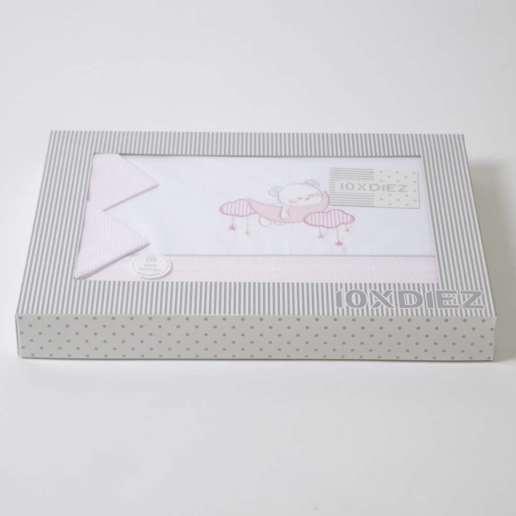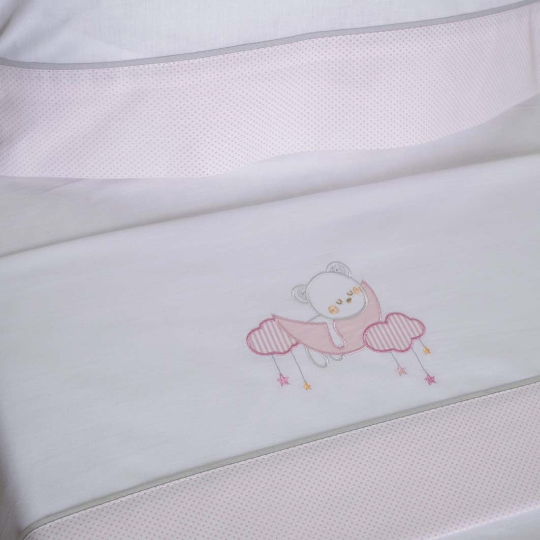 Three-piece crib set made of 100% cotton with embroidered design, available in various colors.