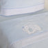 Three-piece crib set in coral fleece with embroidered design and finished with printed star poplin, available in various colors.