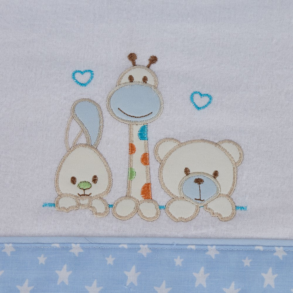 Three-piece crib set made of flannel with embroidered design, available in various colors.