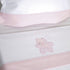 Three-piece crib set made of flannel with embroidered design, available in various colors.