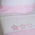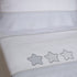 Three-piece flannel baby crib set with embroidered design, available in various colors.
