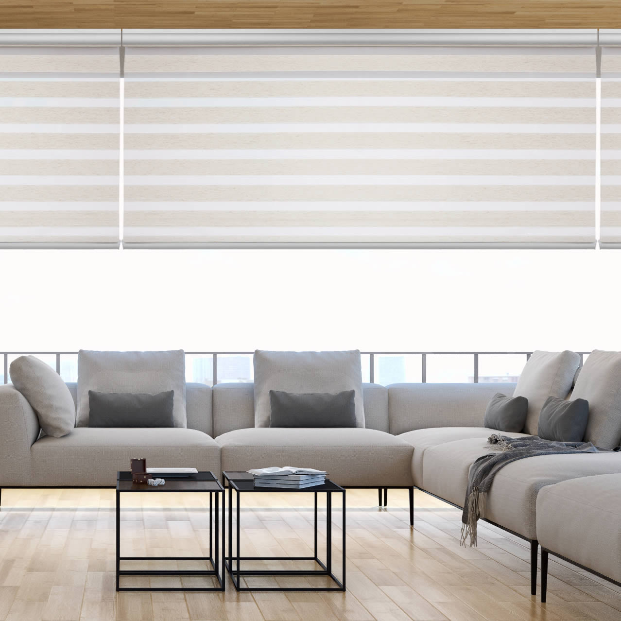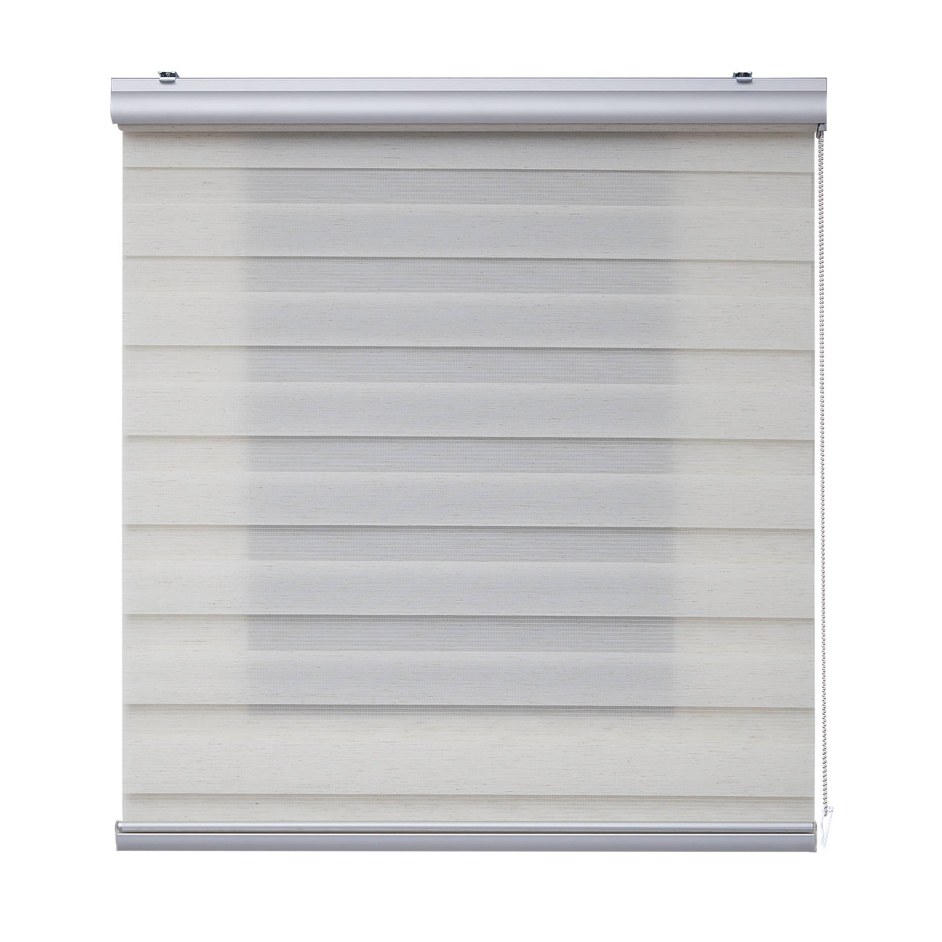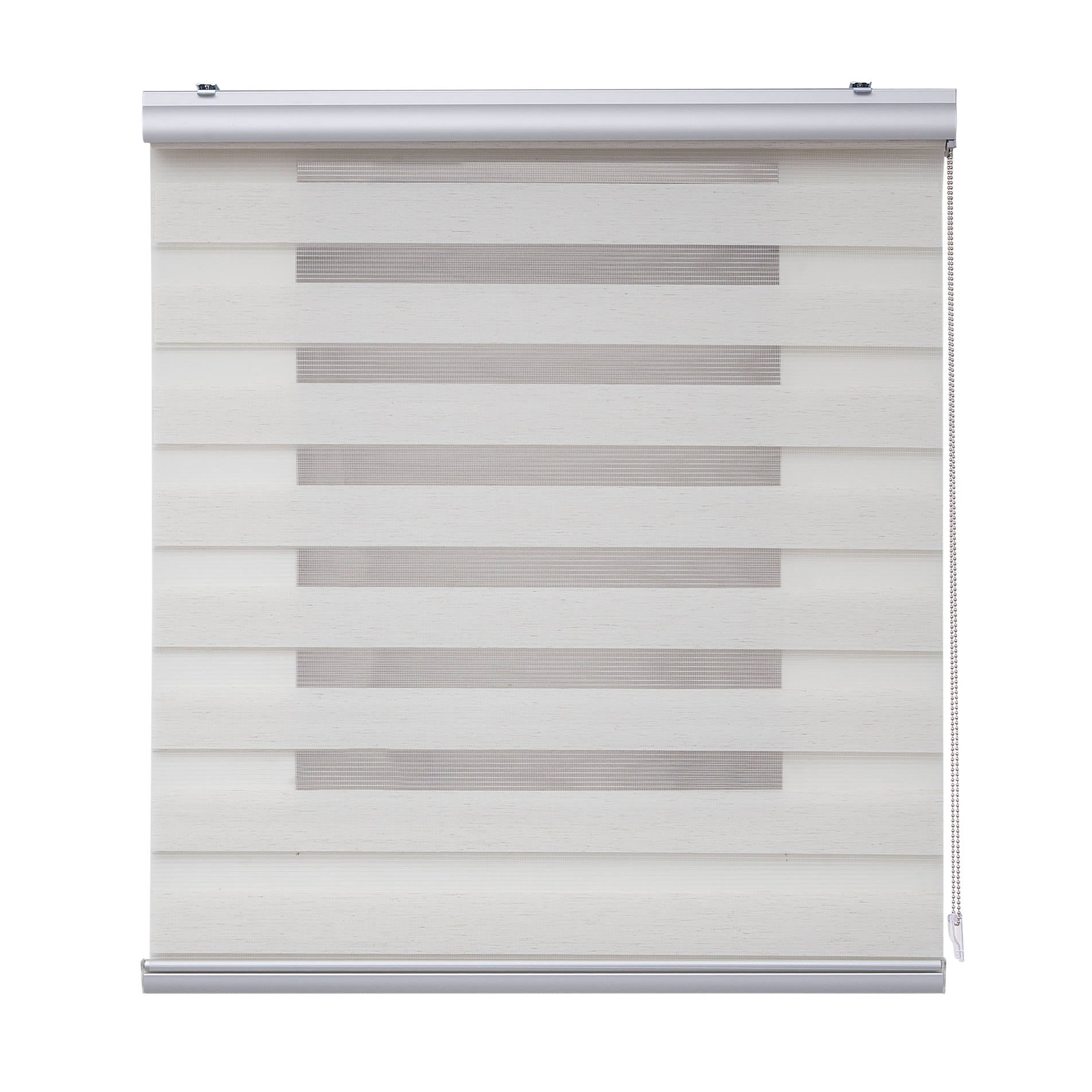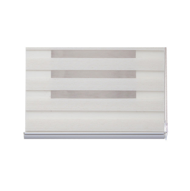 Double roller shade made of transparent striped fabric, whose vertical movement provides a decorative and practical play of light, as well as control over outside visibility and privacy. Mechanism with a top cassette, chain, and aluminum weight.
