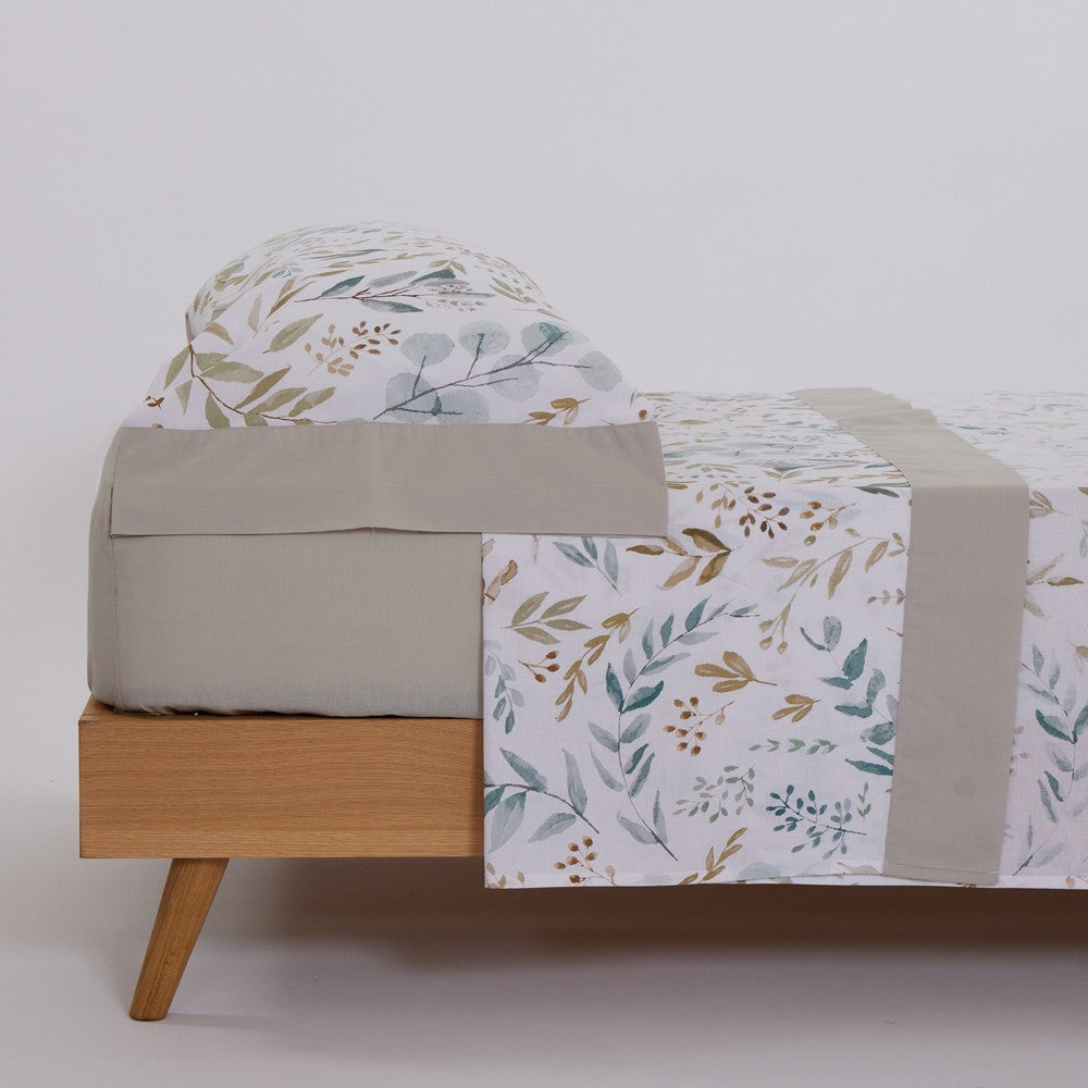 The set consists of a flat sheet, a fitted sheet (for mattresses up to 30cm high and 190/200cm long), and a pillowcase with two openings.