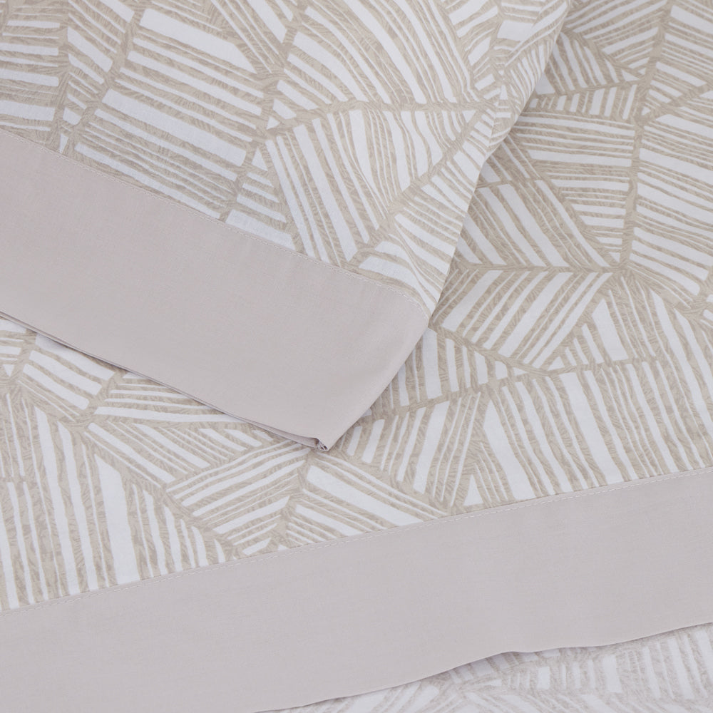 The set consists of a printed top sheet, a plain fitted bottom sheet, and a printed pillowcase with two openings.
