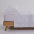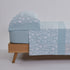 L'ensemble se compose d'un dessus, d'un drap de dessous adaptable (pour matelas jusqu'à 30 cm de hauteur et 190/200 cm de longueur) et d'une taie d'oreiller à deux ouvertures.