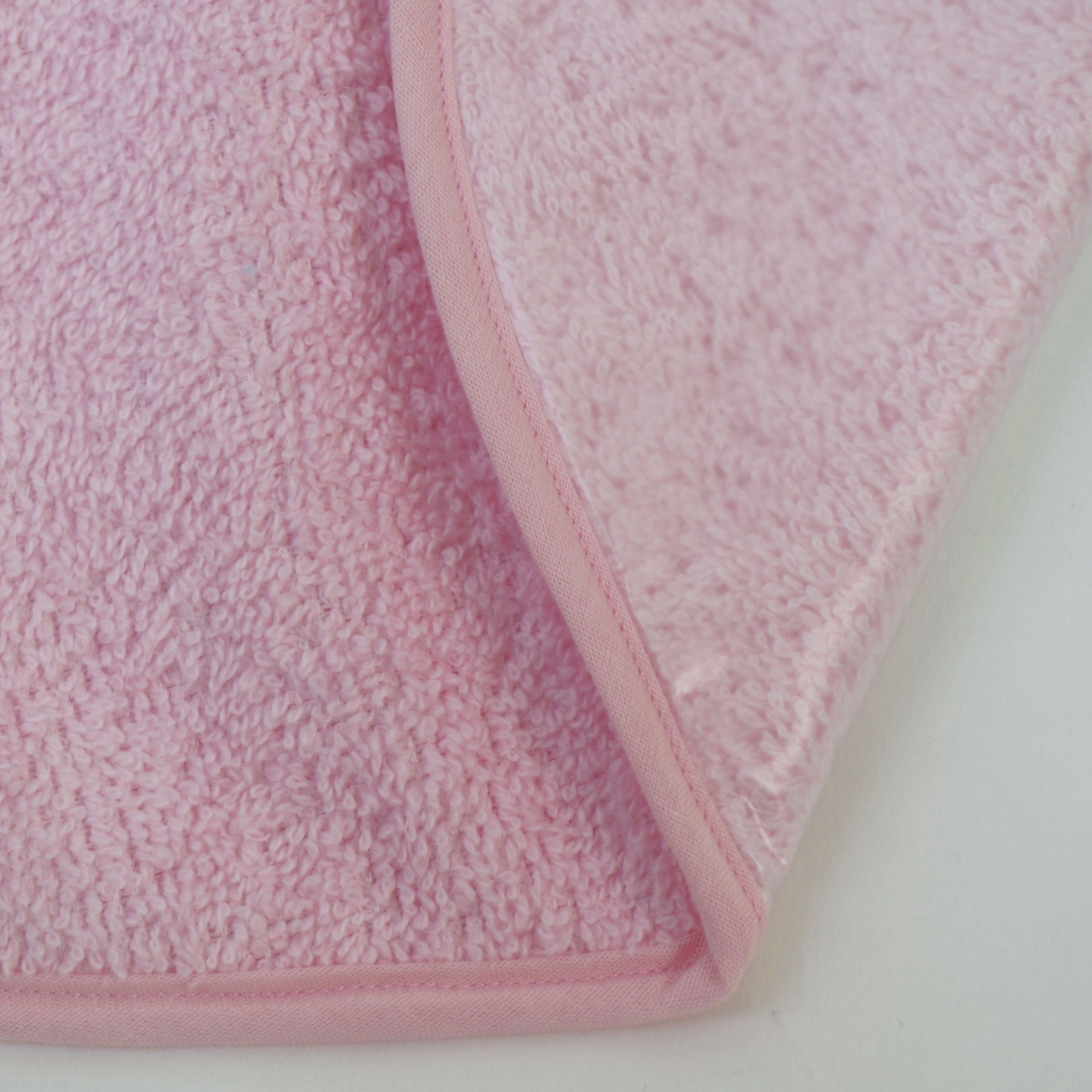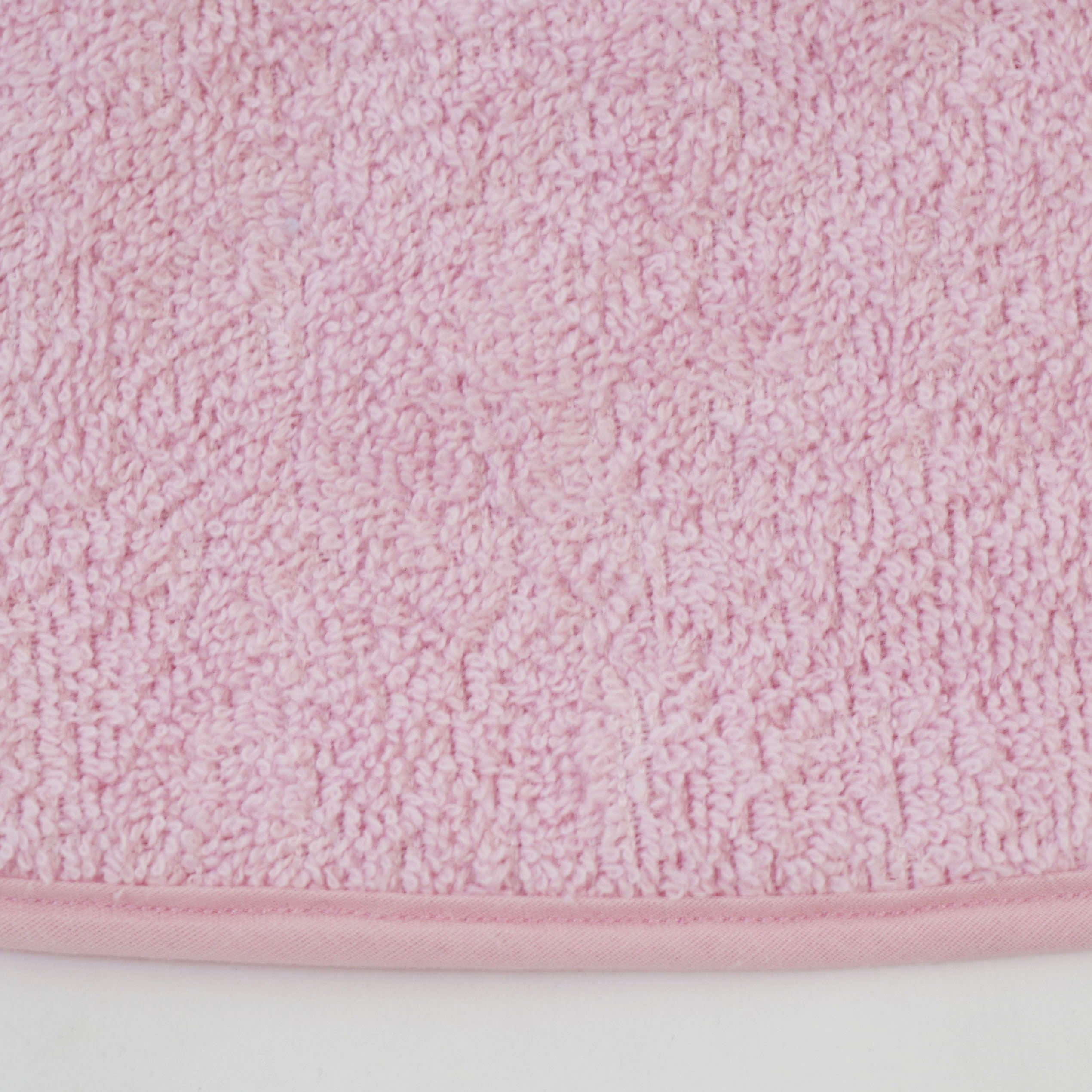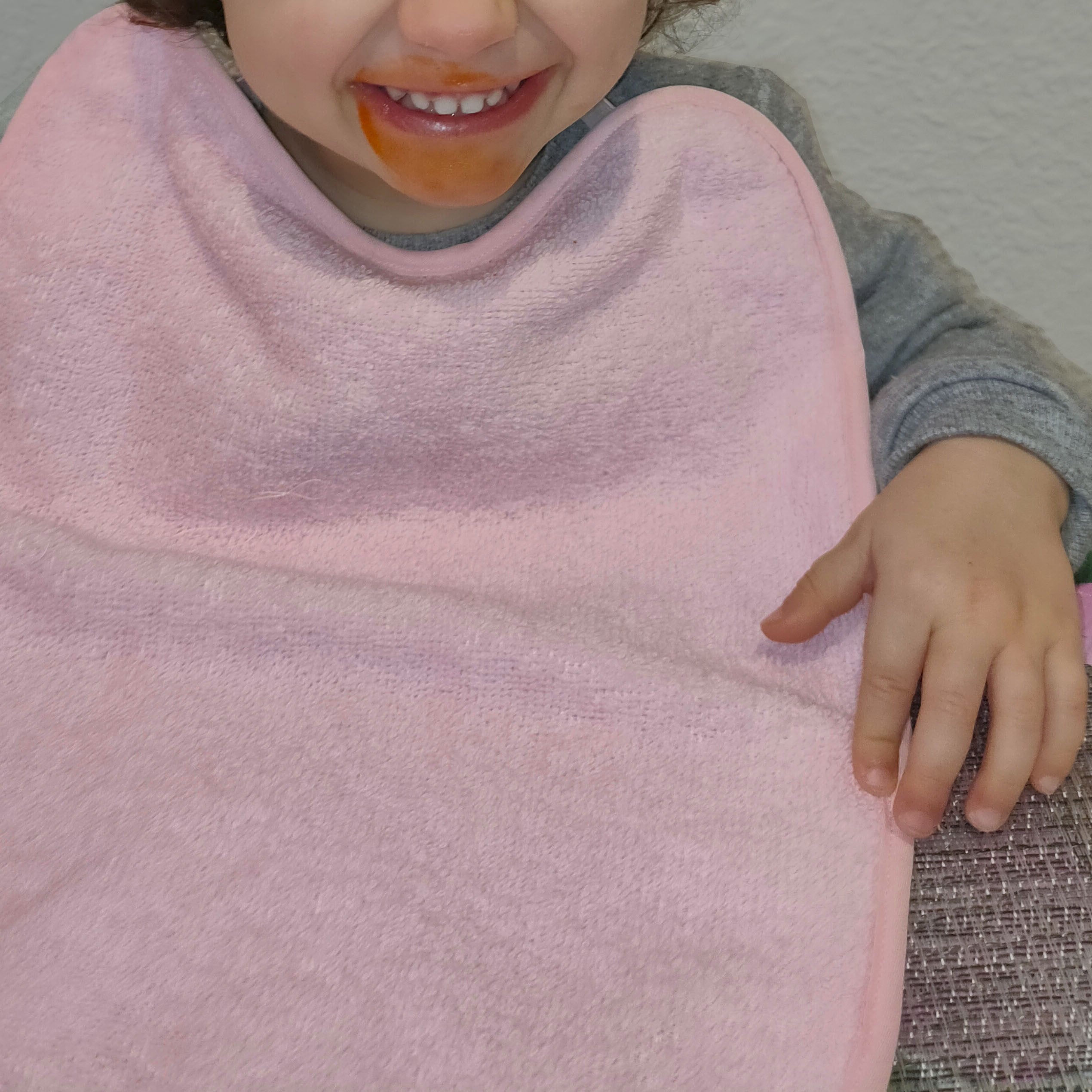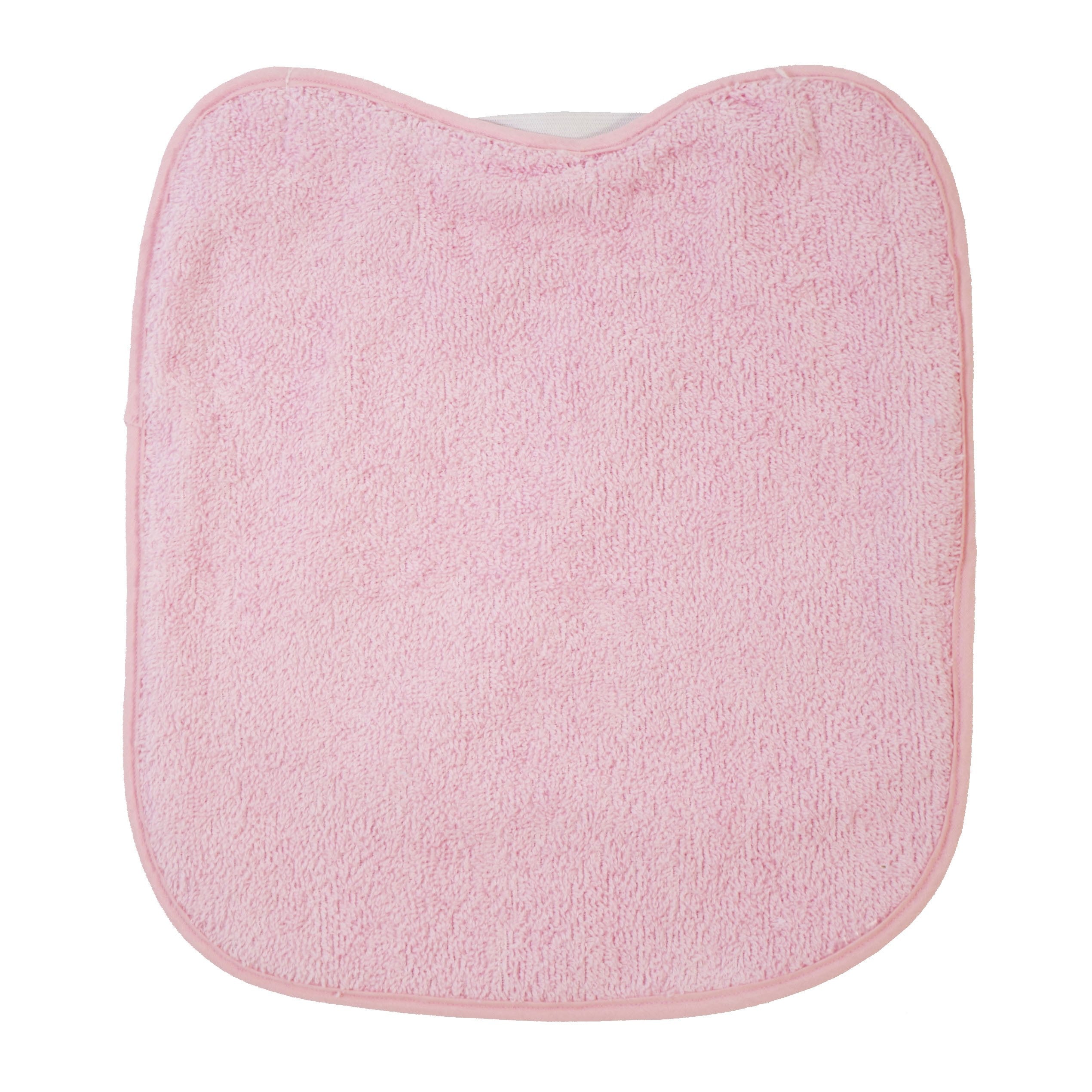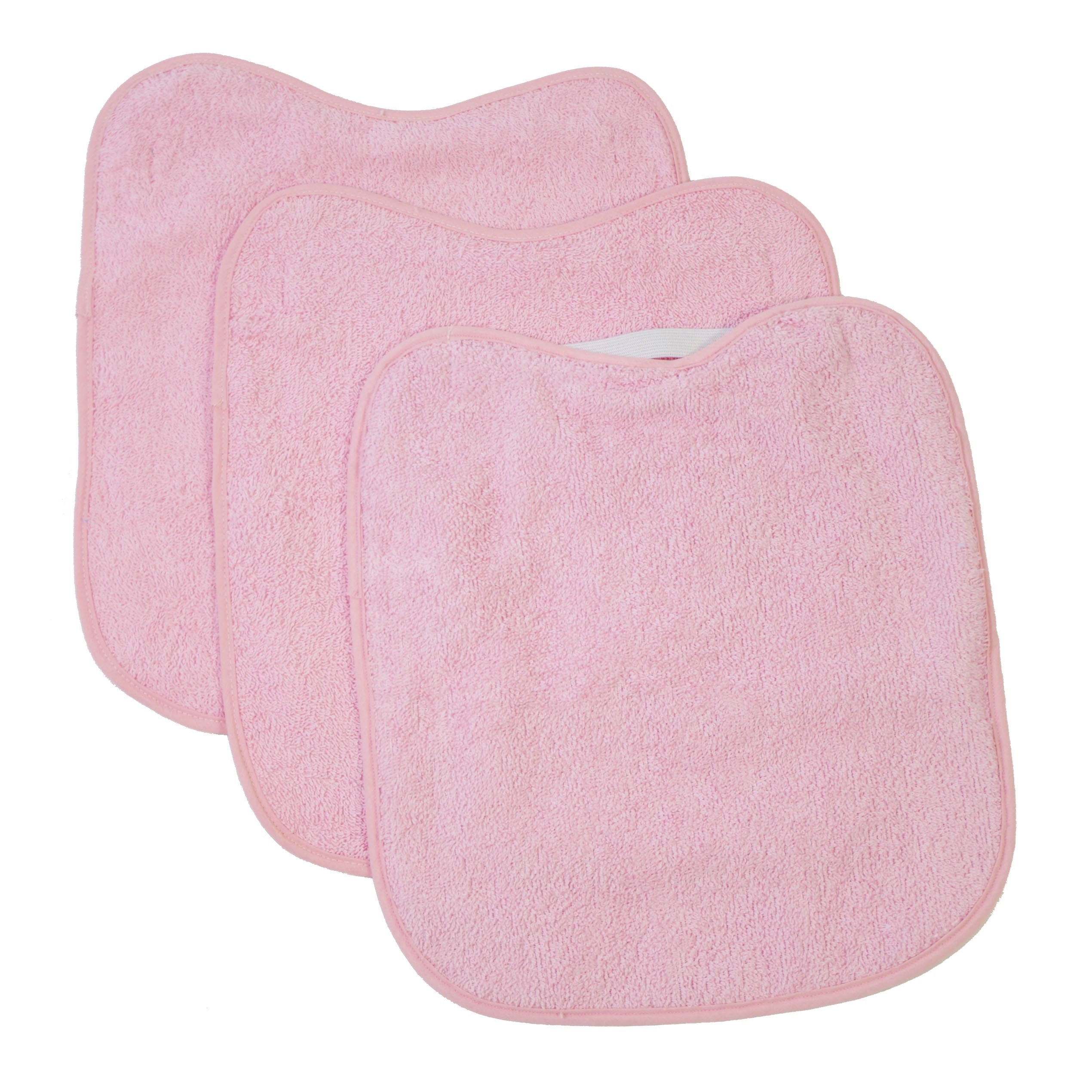 Pack of 3 pink terry cloth bibs, with a plastic backing and elastic neck closure.