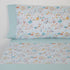 The fitted sheet is delivered in a solid color that matches the print.