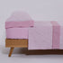 The set consists of a flat sheet, a fitted sheet (for mattresses up to 30cm in height and 190/200cm in length), and a pillowcase with two openings.