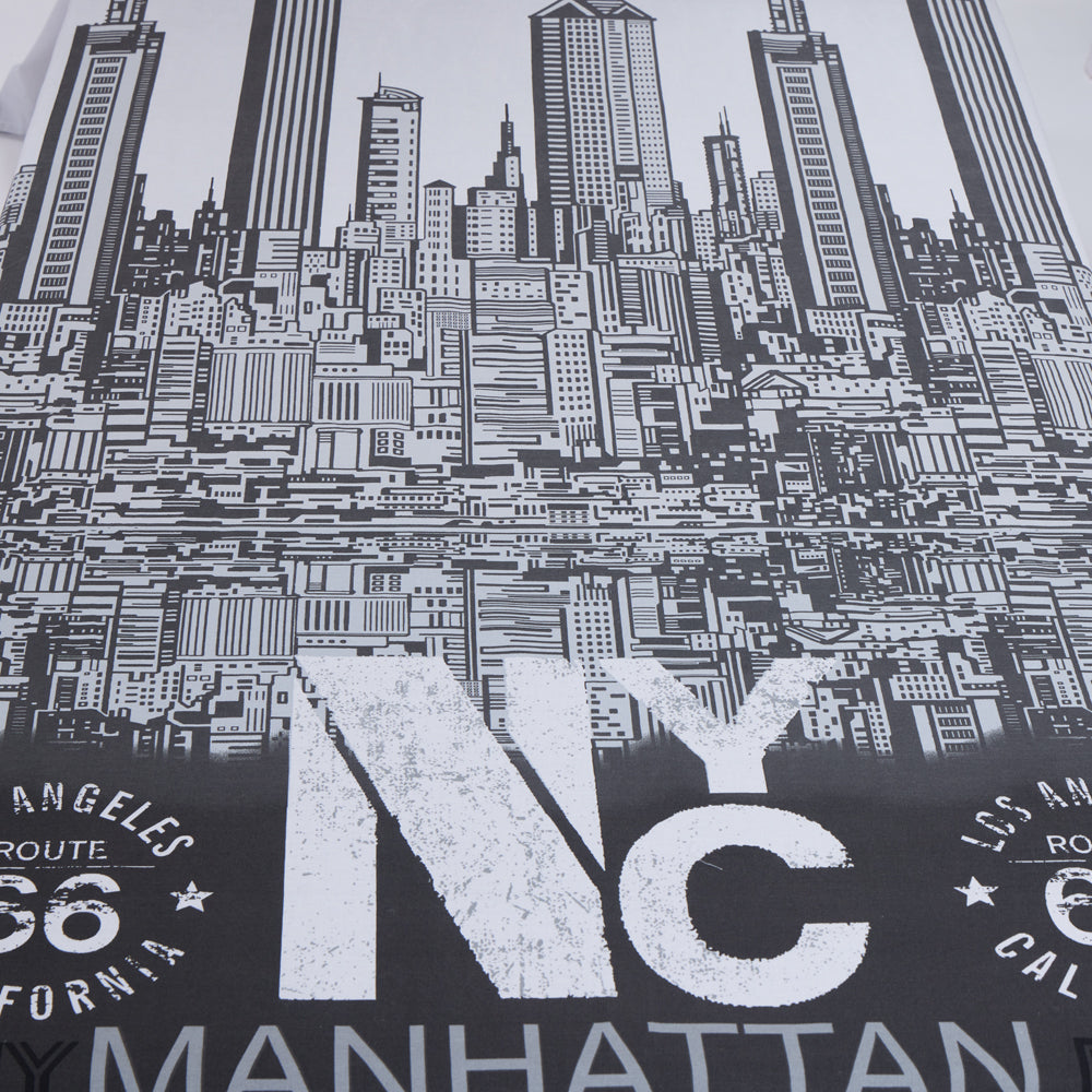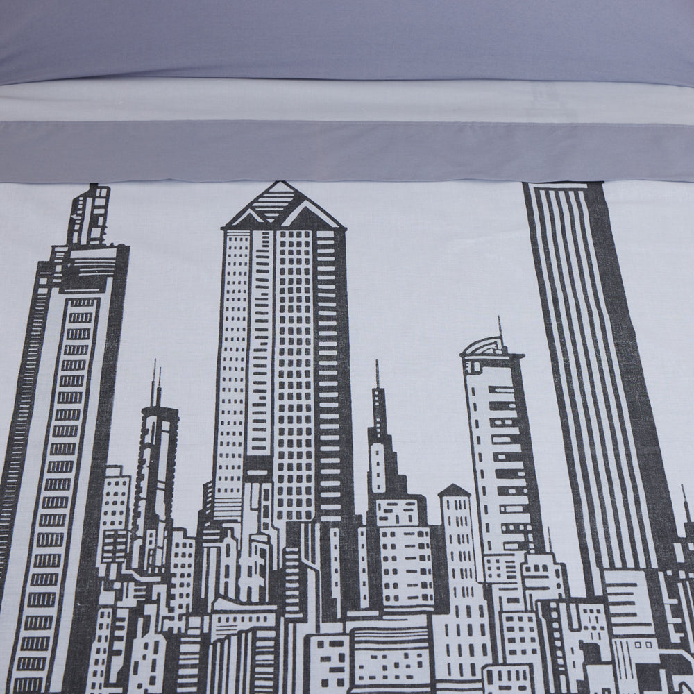 The set consists of a printed top sheet, a plain fitted bottom sheet, and a printed pillowcase with two openings.
