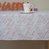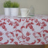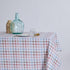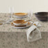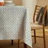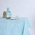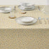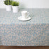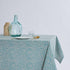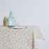Patterned tablecloth, treated with Teflon to create a protective barrier that repels liquids and prevents stain formation.