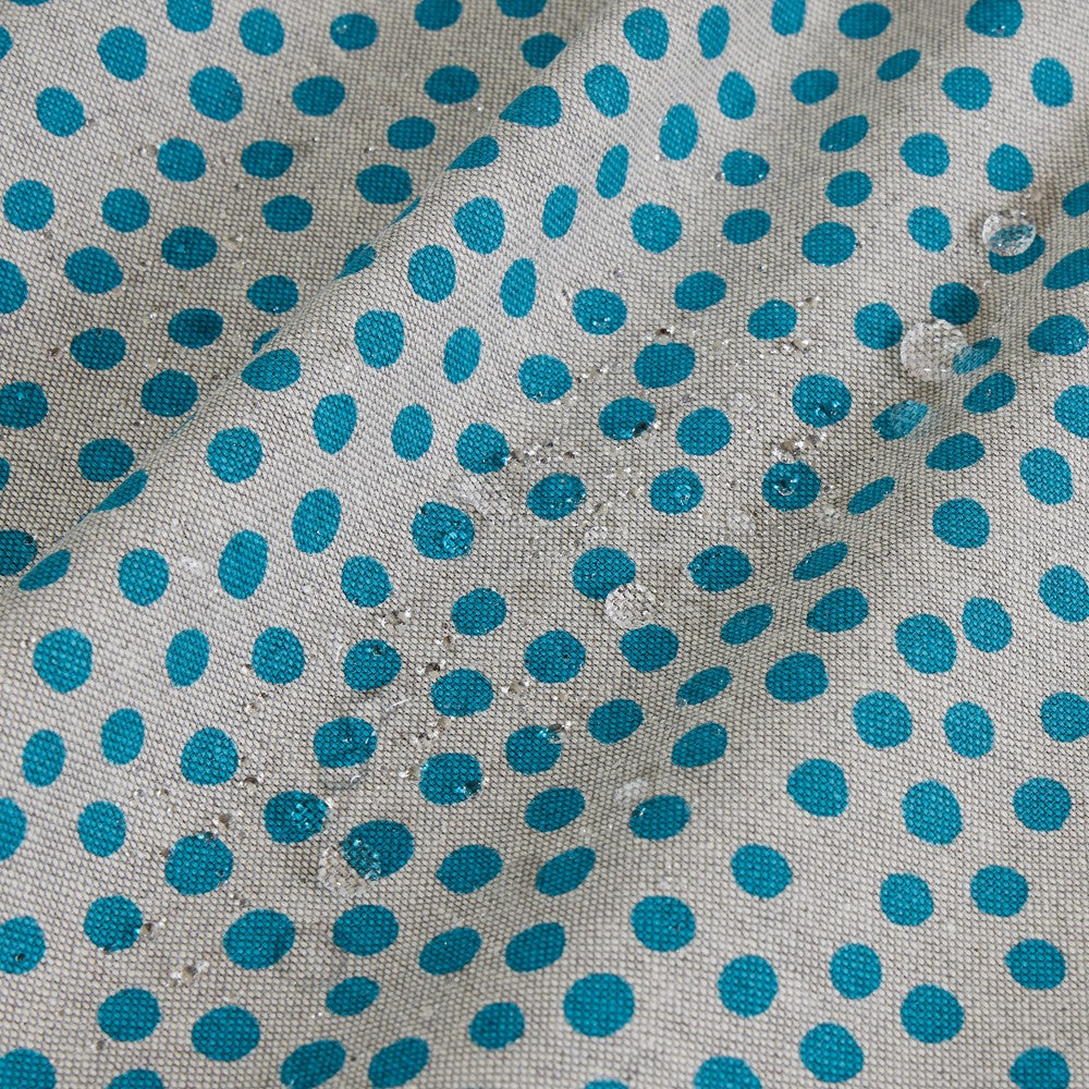 Printed tablecloth, treated with Teflon to create a protective barrier that repels liquids and prevents stain formation.