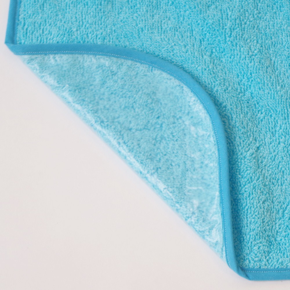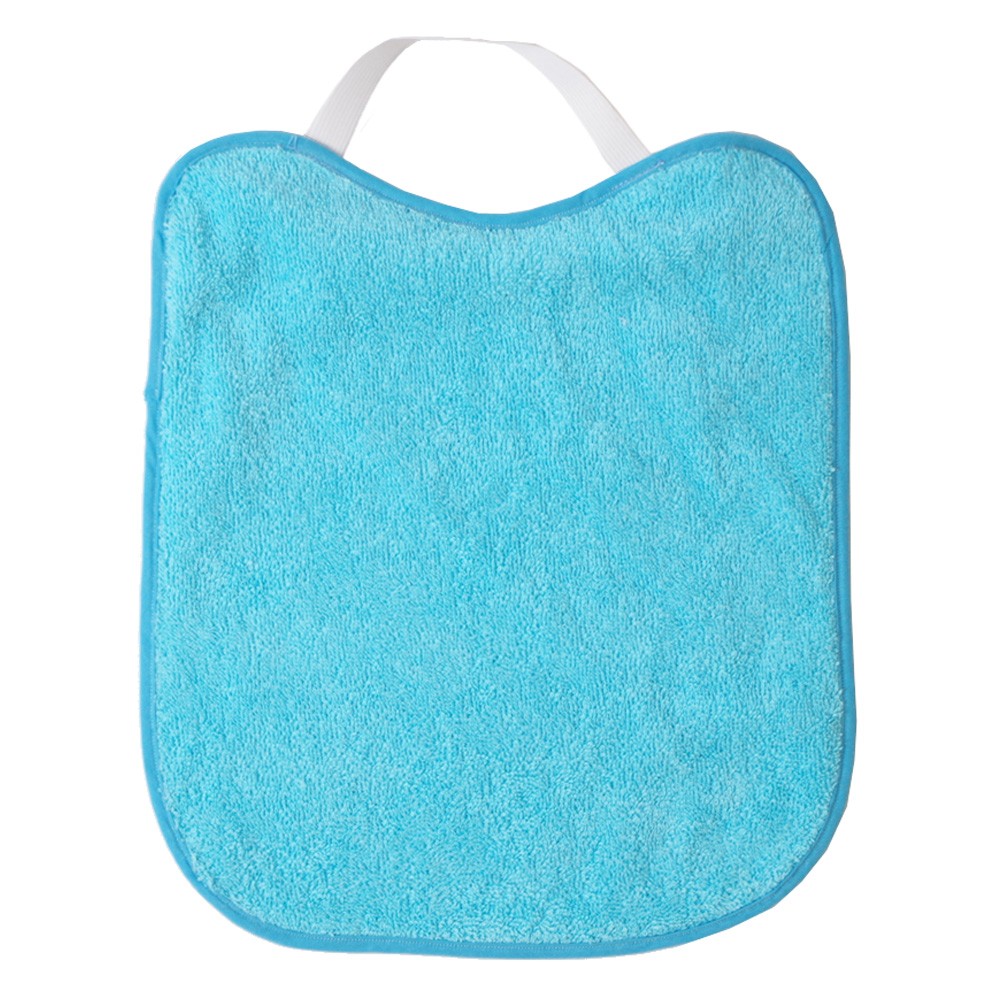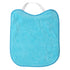 Light blue terry bib, with a plastic backing and elastic around the neck.