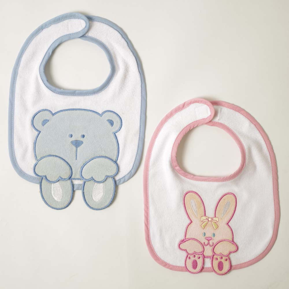 Ensemble de 2 bavoirs bébé en éponge avec appliqué fantaisie brodé.