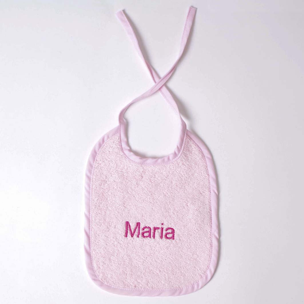 Bavoir en éponge de couleur unie personnalisé avec le nom brodé en lettres minuscules de style Helvetica avec une majuscule.