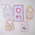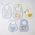 Assortiment de bavoirs, avec différentes formes, tailles et couleurs. Deux modèles en éponge avec broderie et trois bavoirs en jersey uni avec broderie ou imprimé.