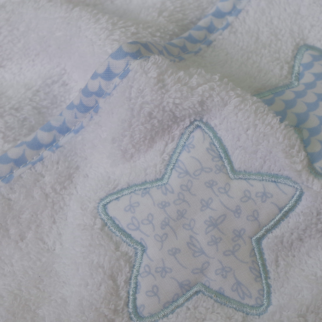 Cape de bain en éponge pour bébé avec broderie centrale et biais autour.