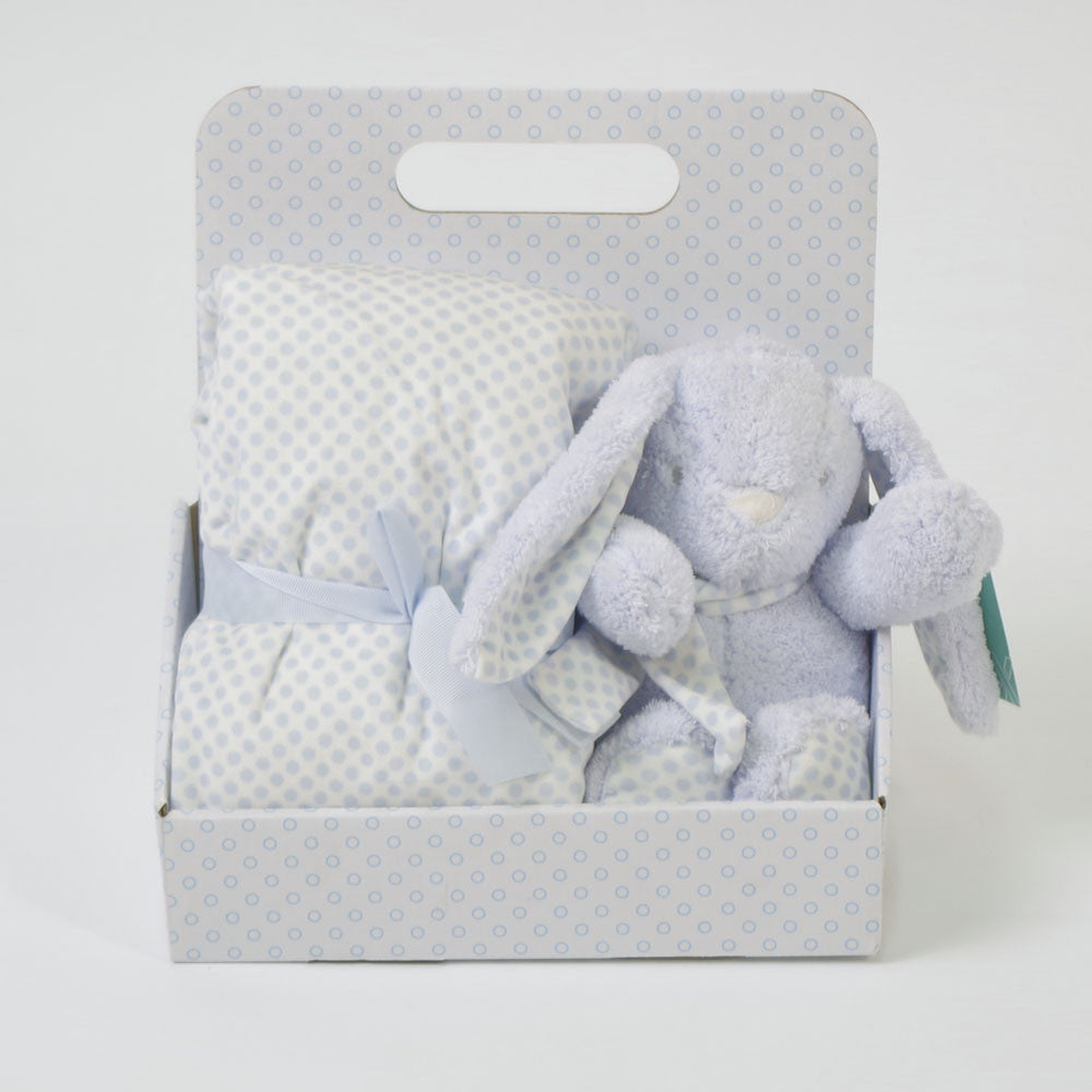 Cette petite boîte curieuse est le cadeau parfait pour tout bébé. Dans la boîte, vous trouverez une couverture douce et chaude de 75 cm de large x 75 cm de long avec un imprimé à pois. et un lapin câlin tout aussi doux que le doudou et de 30 cm de haut.