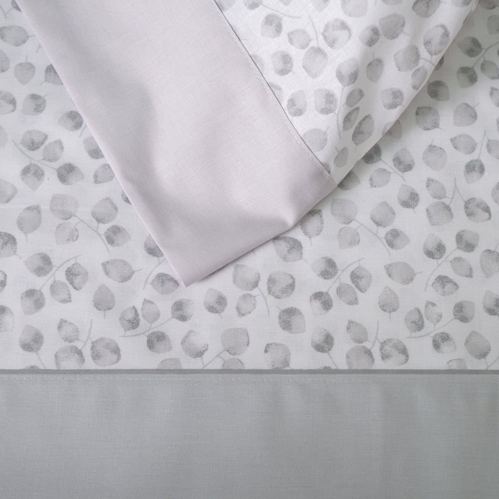 Le drap-housse est de couleur unie assortie à l'imprimé.