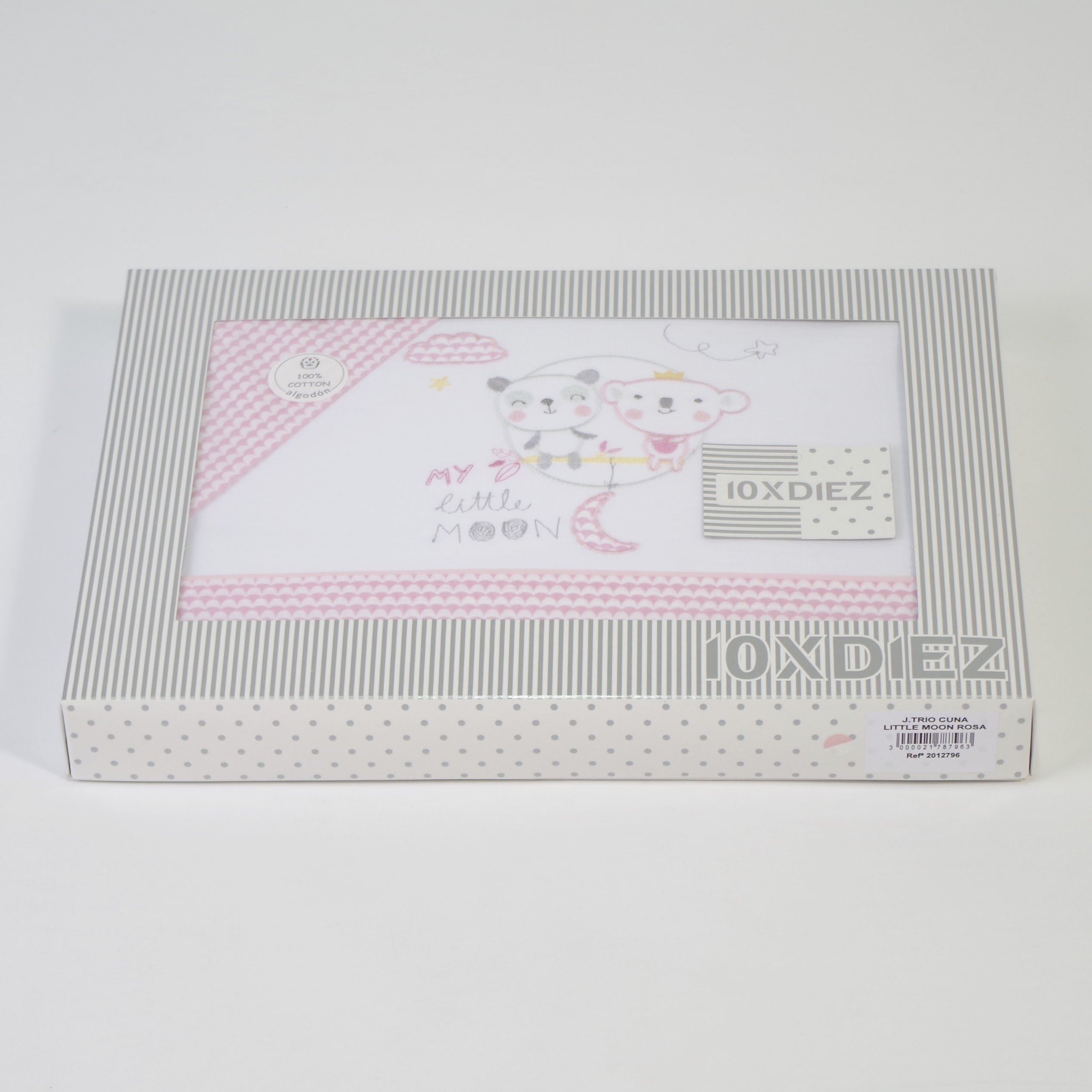 Ensemble de trois pièces pour lit de bébé avec dessin brodé, disponible en plusieurs couleurs.