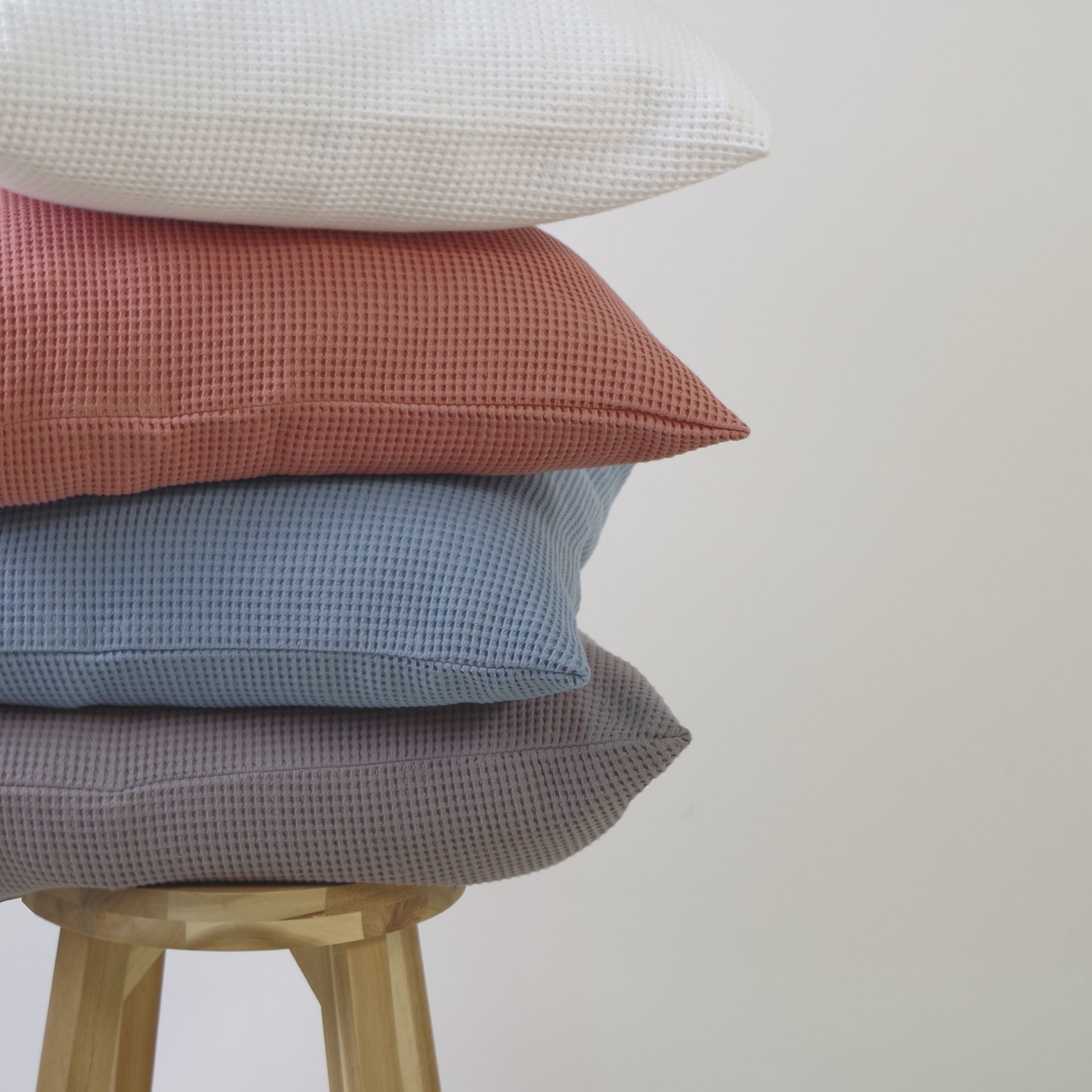 Housse de coussin en nid d'abeille 100 % coton. Il a les couleurs parfaites pour habiller votre maison par temps chaud, quand il est recommandé d'utiliser des couleurs fraîches et claires. Tissu avec une finition lavée qui lui donne de la douceur et un aspect naturel et agréable.