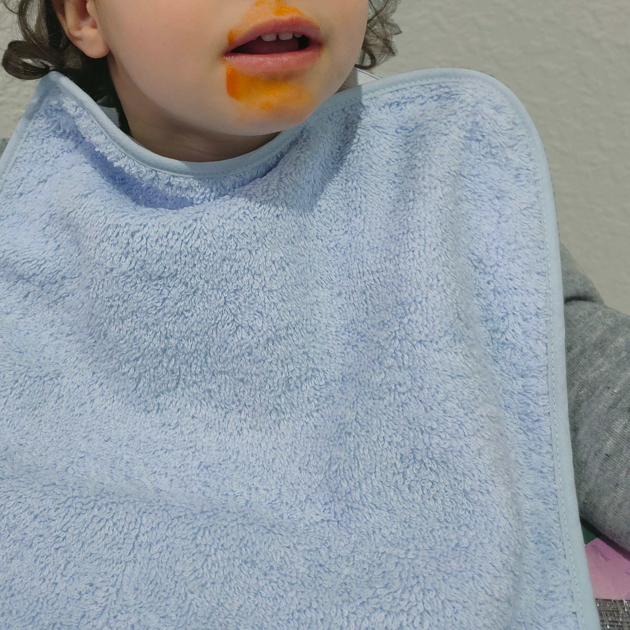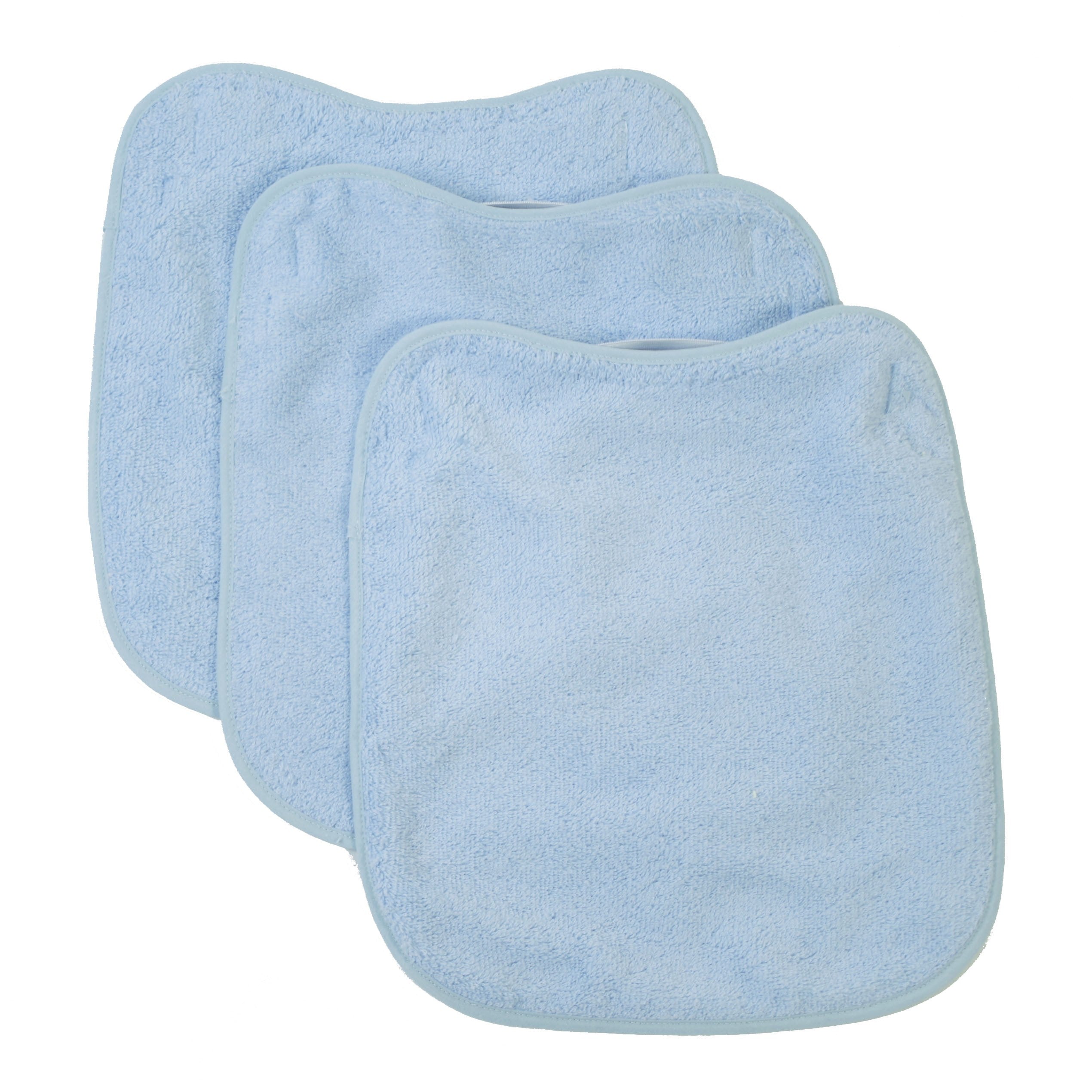 Lot de 3 bavoirs bébé en éponge bleu clair avec élastique. Extérieur en tissu éponge lavable et dos imperméable. Dimensions : 33