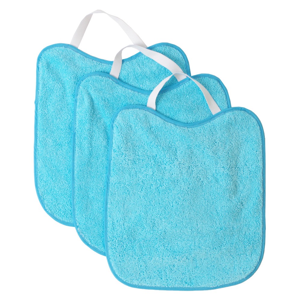 Pack de 3 bavoirs en éponge couleur turquoise, revers en plastique et avec élastique.