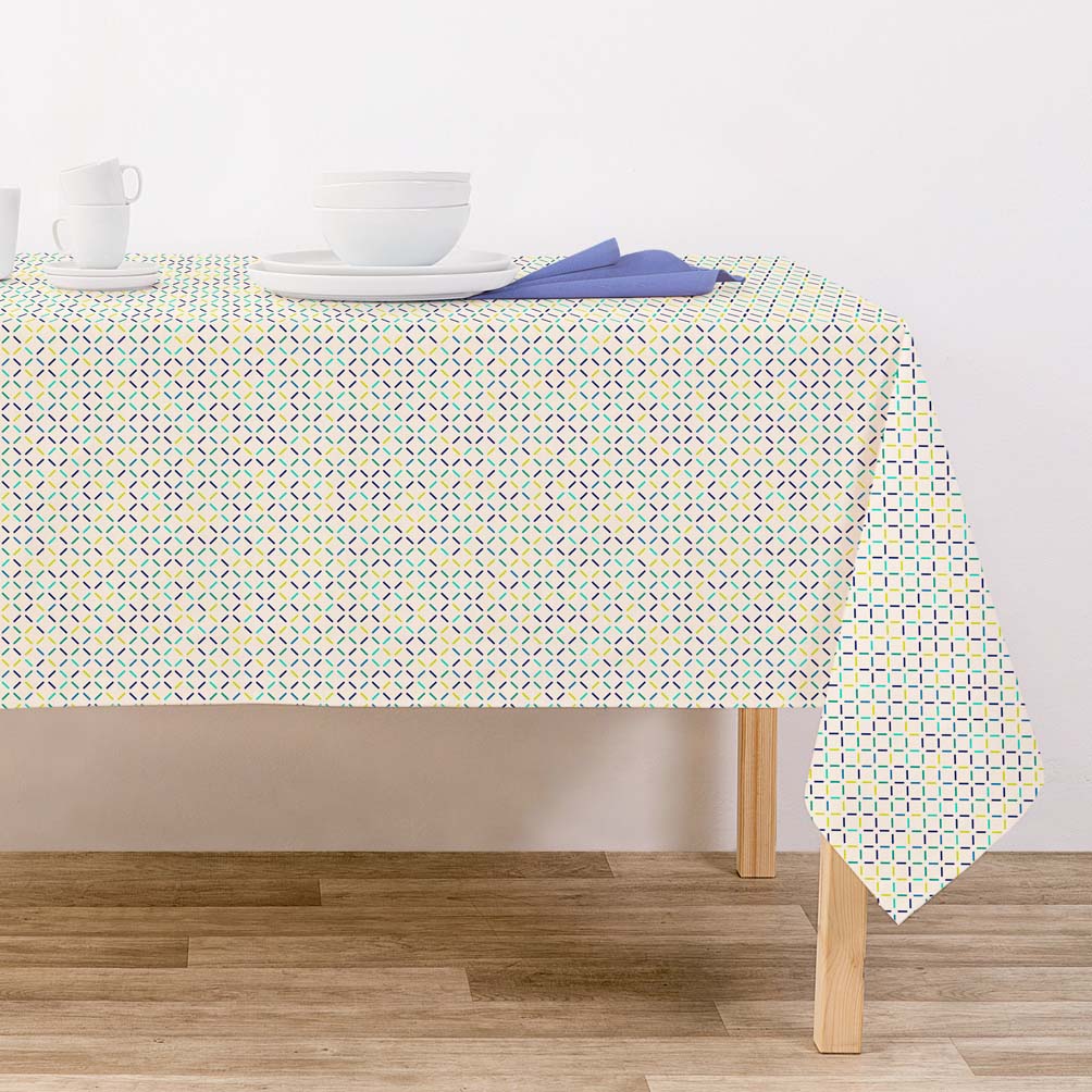 Nappe imprimée, traitée avec du Téflon créant une barrière de protection qui repousse les liquides et évite la formation de taches.