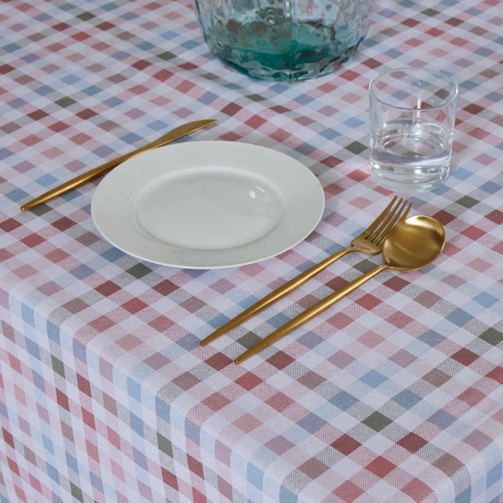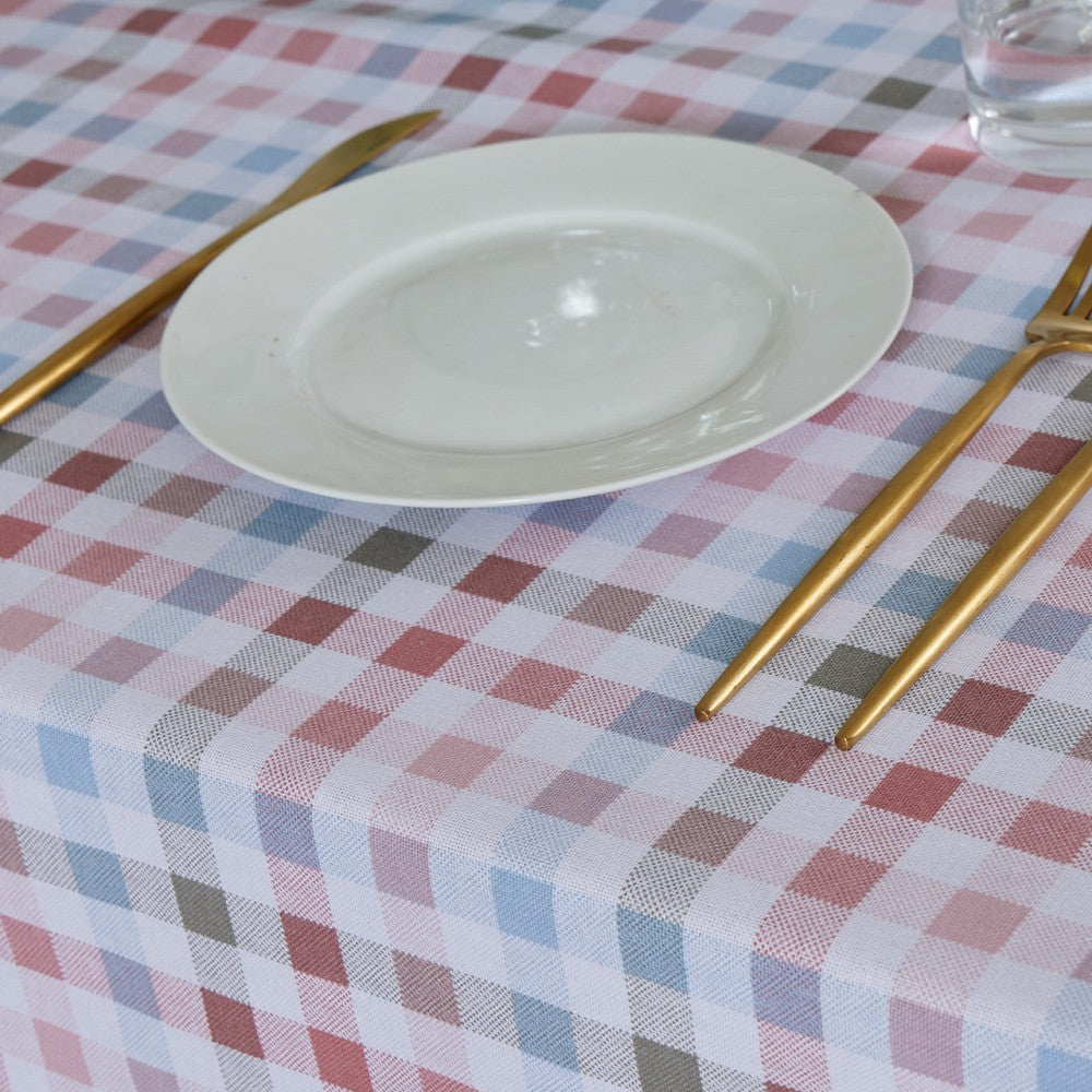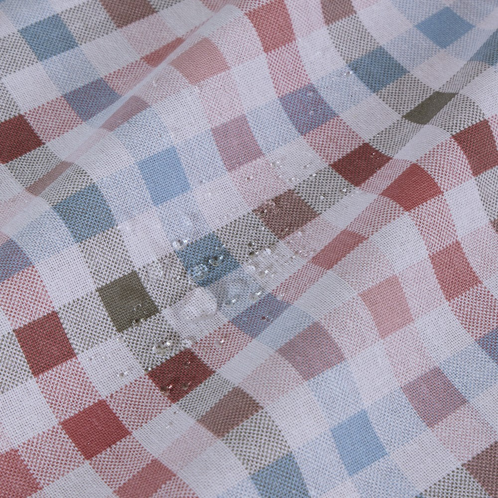 Nappe imprimée, traitée avec du Téflon créant une barrière de protection qui repousse les liquides et évite la formation de taches.