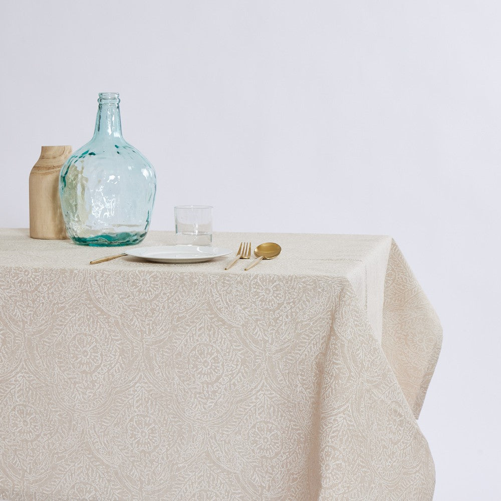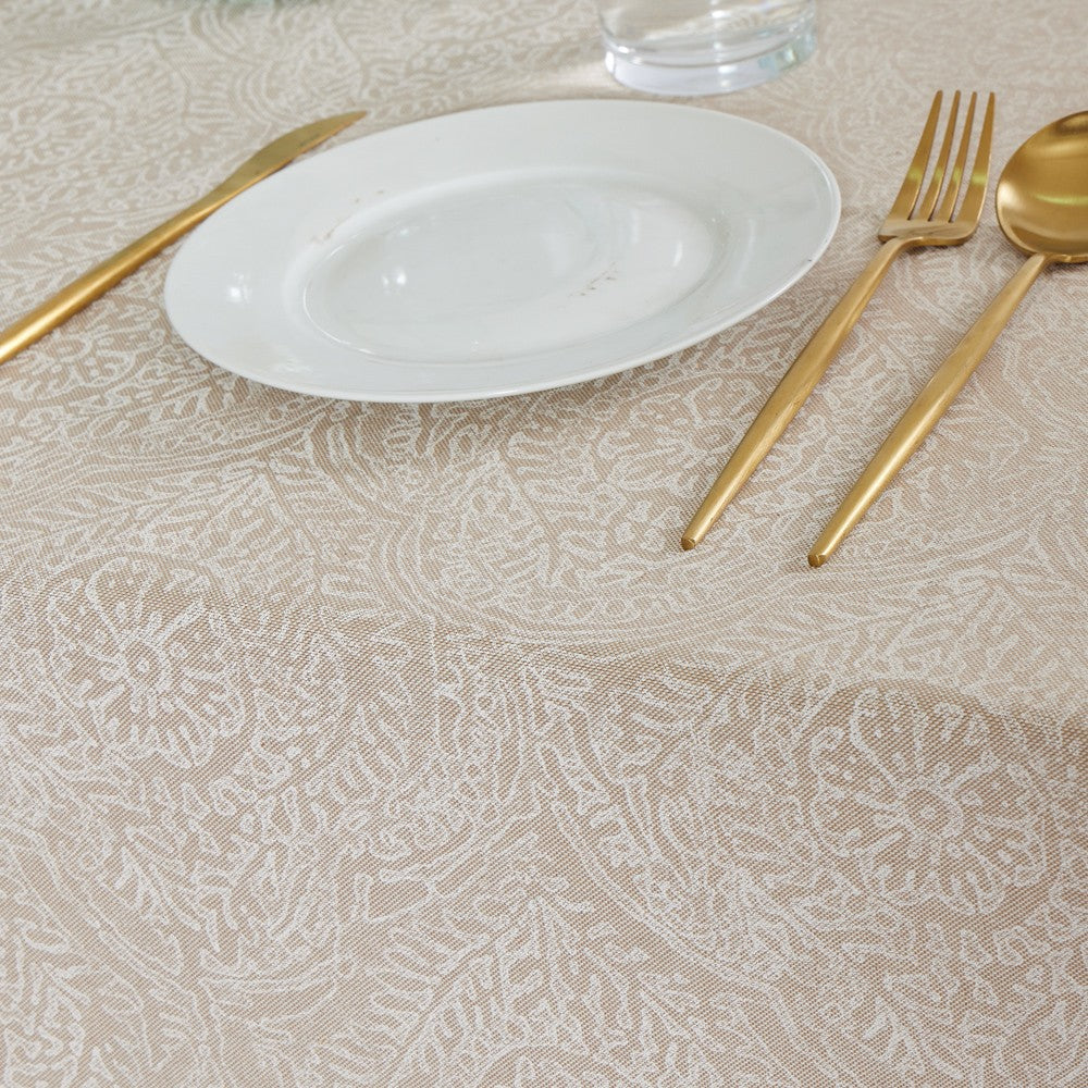 Nappe imprimée, traitée avec du Téflon créant une barrière de protection qui repousse les liquides et évite la formation de taches.
