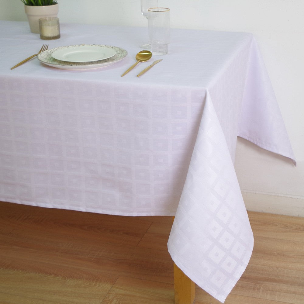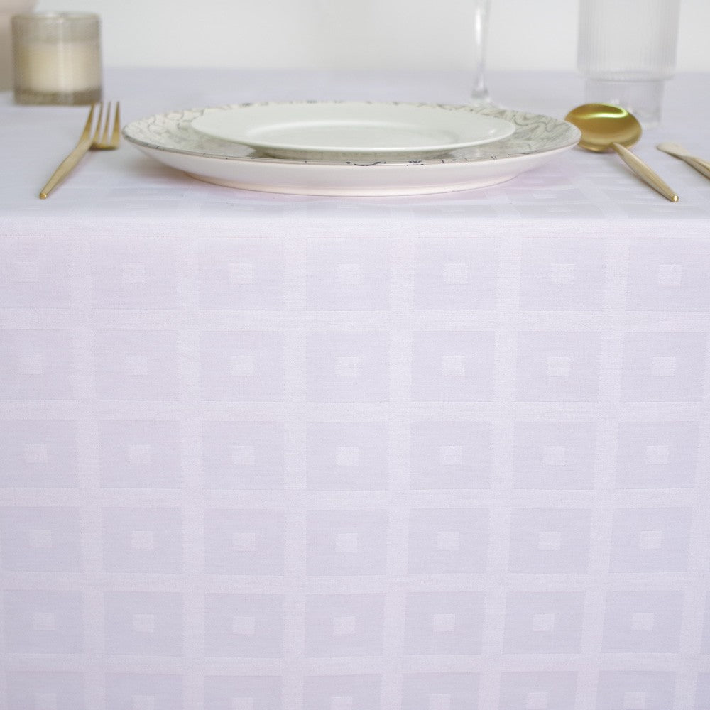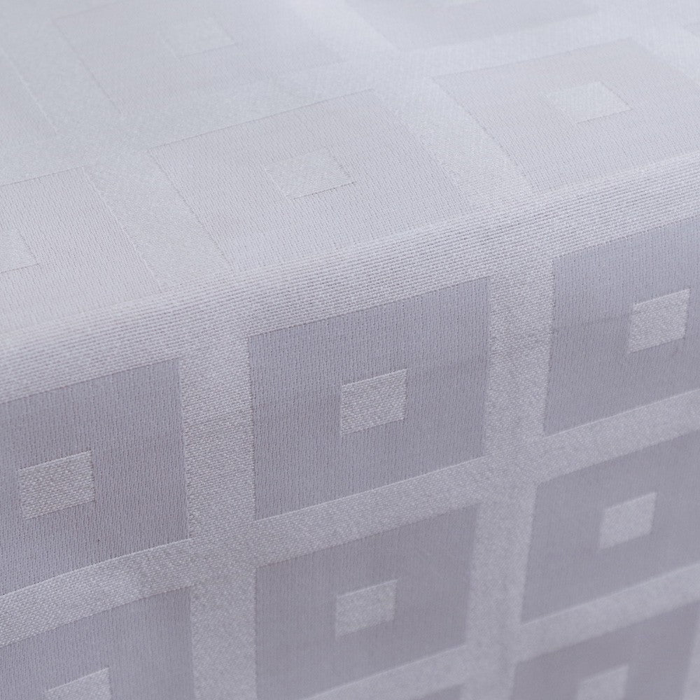 Nappe en satin jacquard à carreaux et de couleur blanche, idéale pour l'hôtellerie.