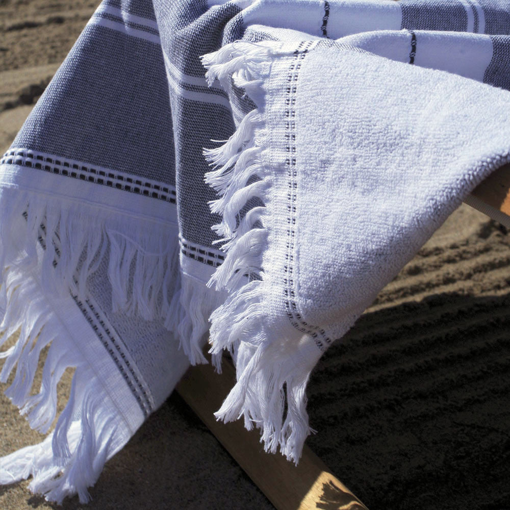 Foutah à rayures et à franges aux extrémités, tissé avec une peluche lisse de couleur blanche au revers.