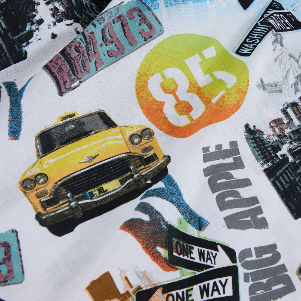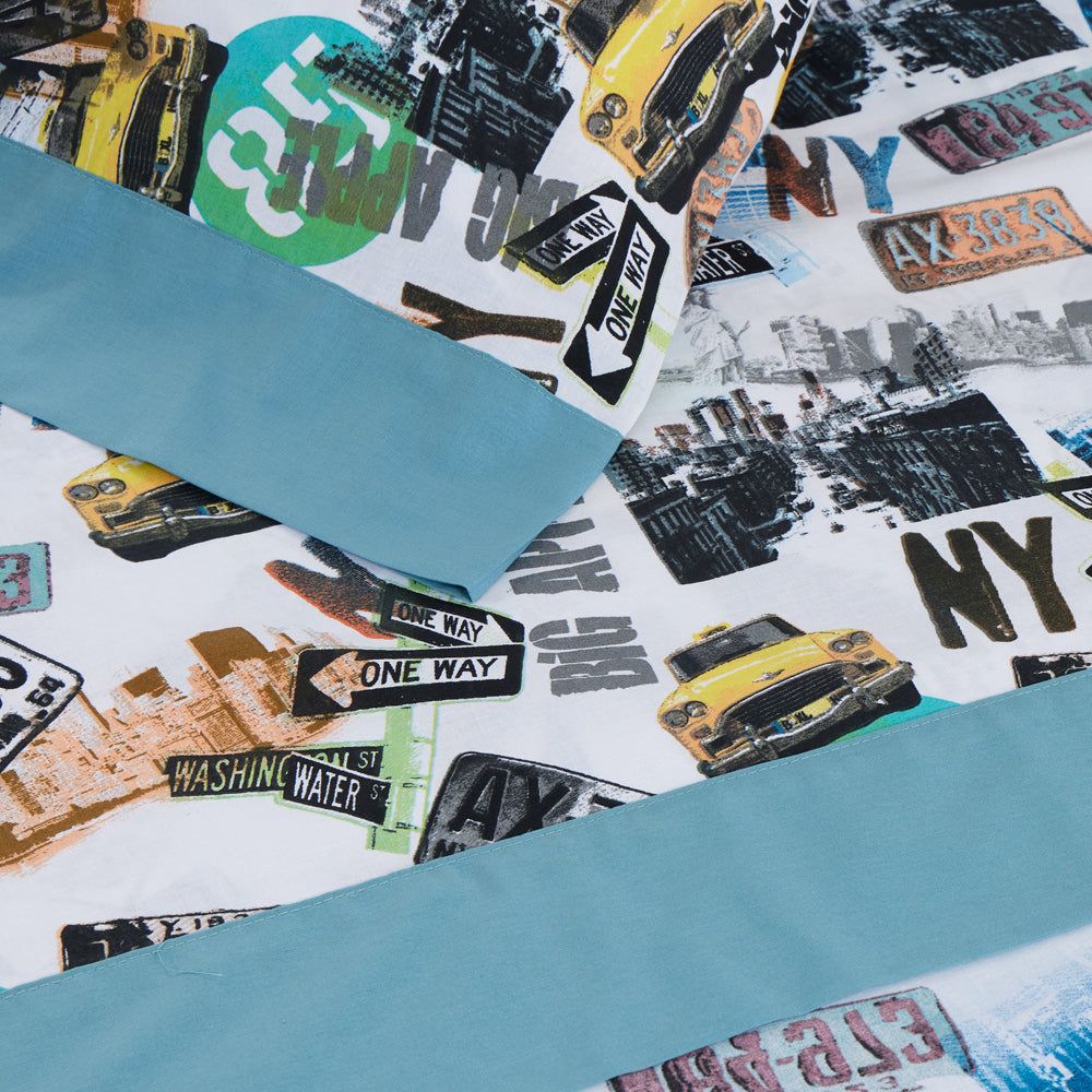 L'ensemble se compose d'un drap de dessus imprimé, d'un drap-housse uni et d'une taie d'oreiller imprimée avec deux ouvertures.