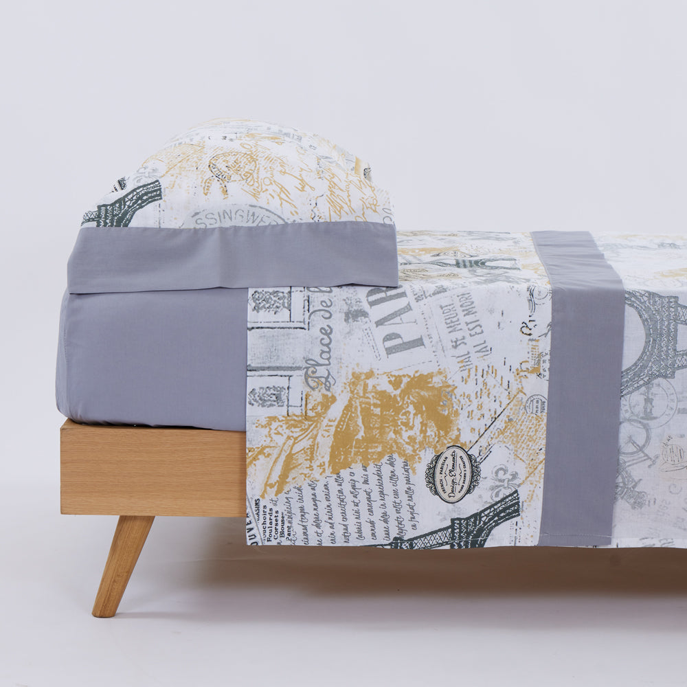 L'ensemble se compose d'un drap de dessus imprimé, d'un drap-housse uni et d'une taie d'oreiller imprimée avec deux ouvertures.