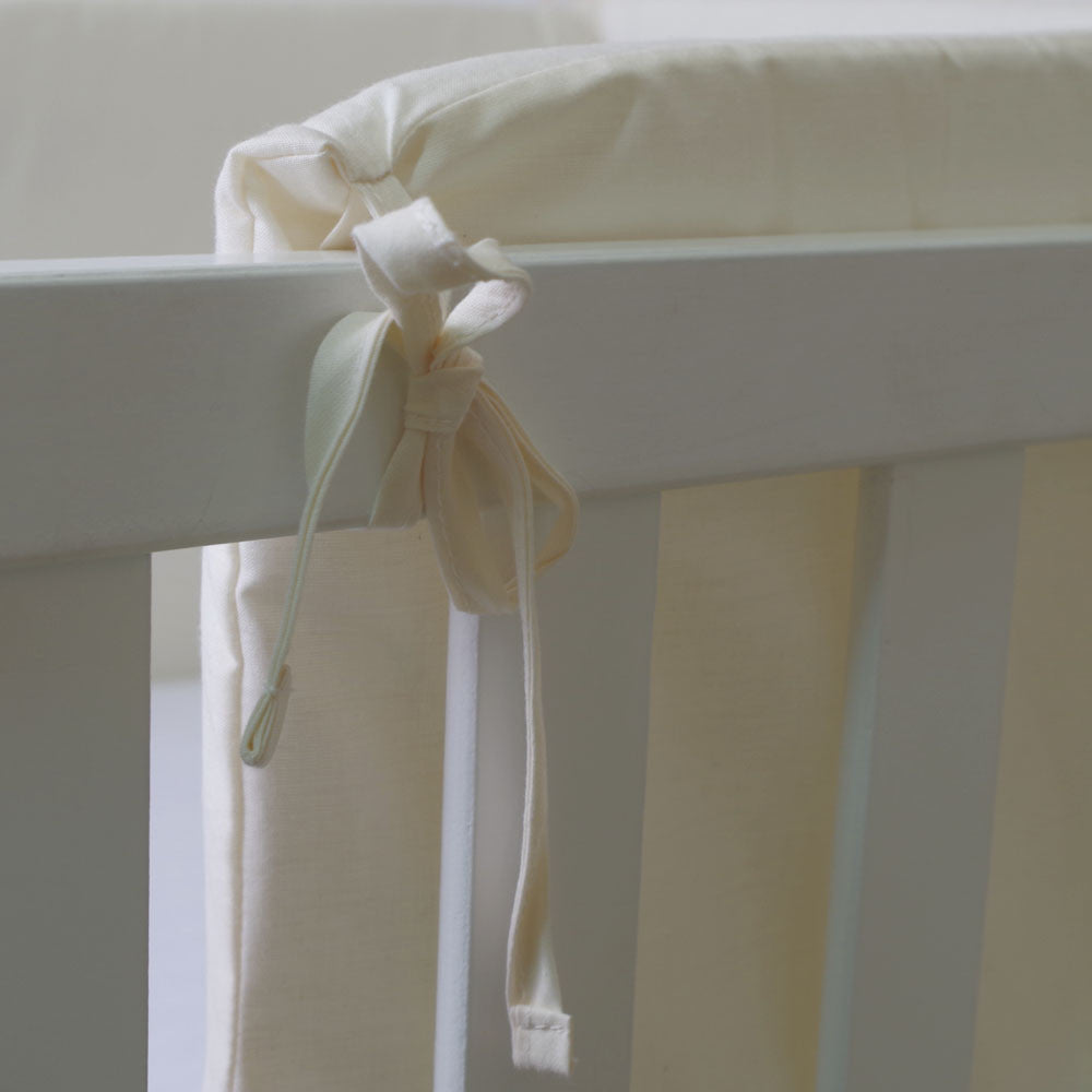 Tour de lit à placer à l'intérieur du berceau pour protéger la tête du bébé, il est équipé de bandes de tissu pour l'attacher à la barrière du berceau et peut être facilement lavé en machine.