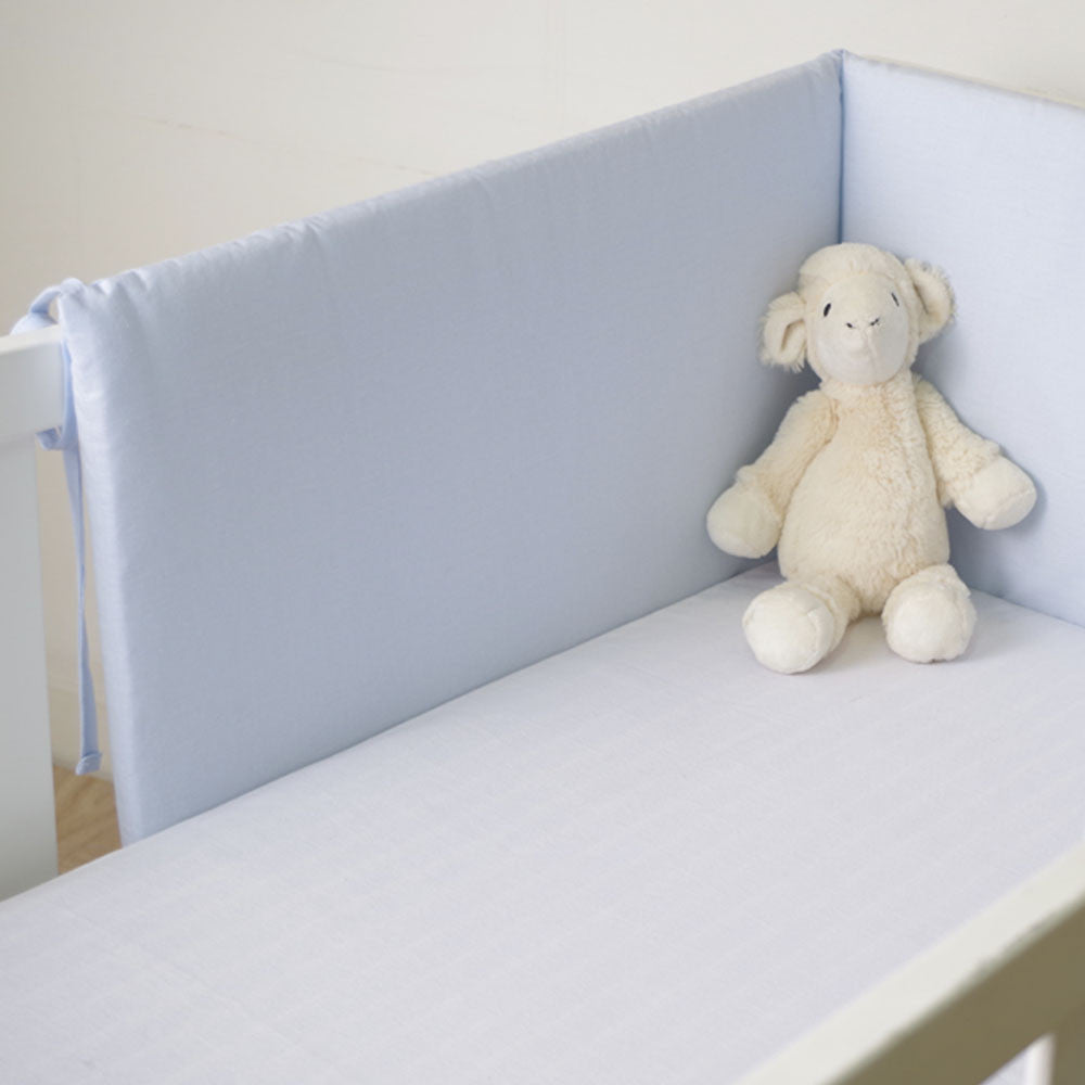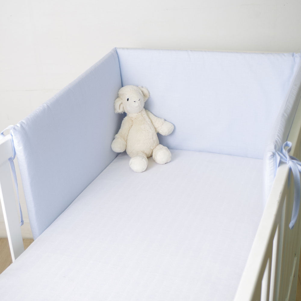 Tour de lit à placer à l'intérieur du berceau pour protéger la tête du bébé, il est équipé de bandes de tissu pour l'attacher à la barrière du berceau et peut être facilement lavé en machine.