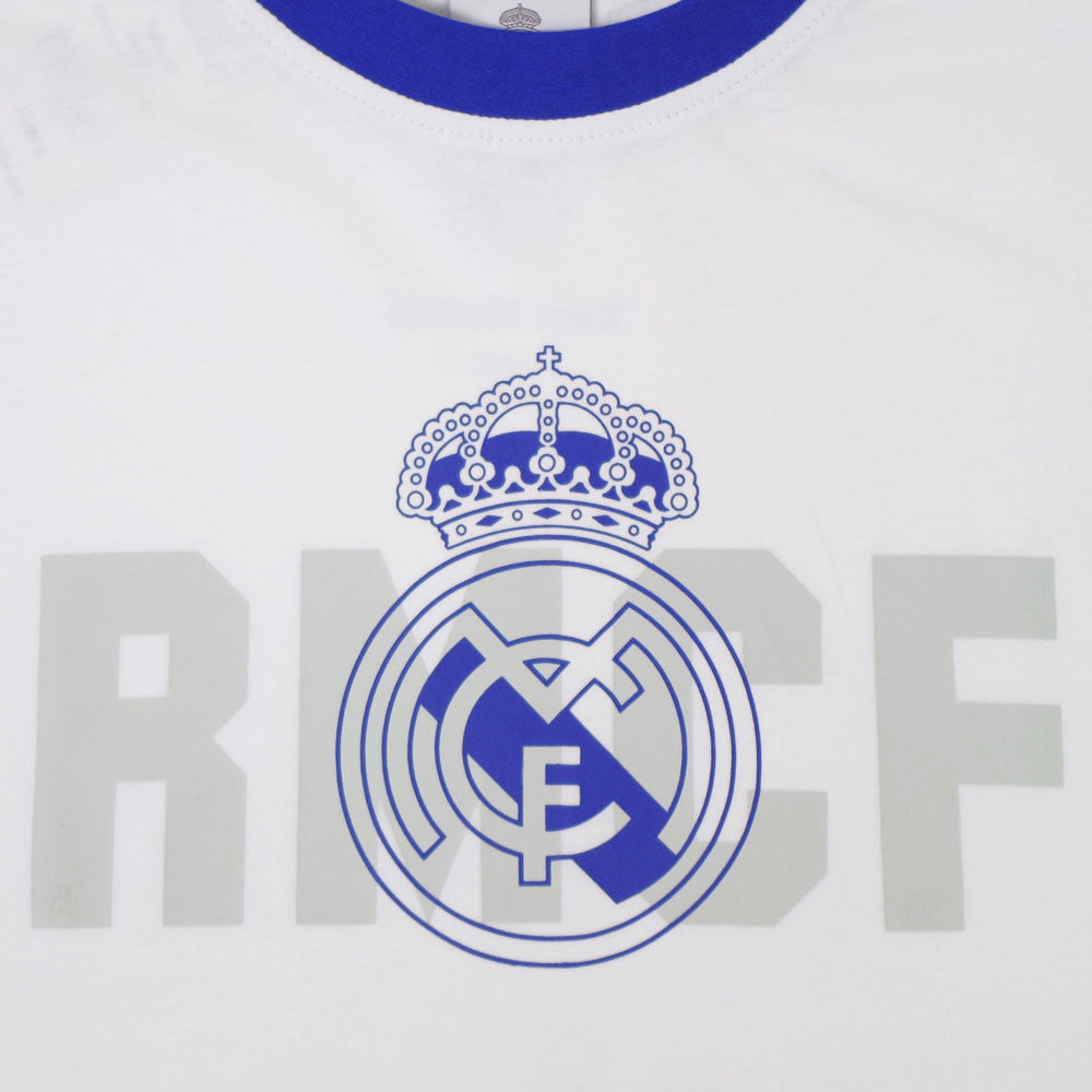 Pyjama pour enfant du Real Madrid en jersey blanc et bleu avec le blason du Real Madrid imprimé sur le devant et un imprimé du blason également sur le pantalon. T-shirt à manches courtes et short idéal pour l'été.