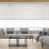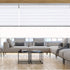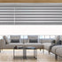 Store enrouleur double en tissu à bandes transparentes dont le mouvement vertical offre un jeu de lumière décoratif et pratique, ainsi qu'un contrôle de la vue extérieure et de l'intimité. Mécanisme avec caisson supérieur, chaînette et poids en aluminium.
