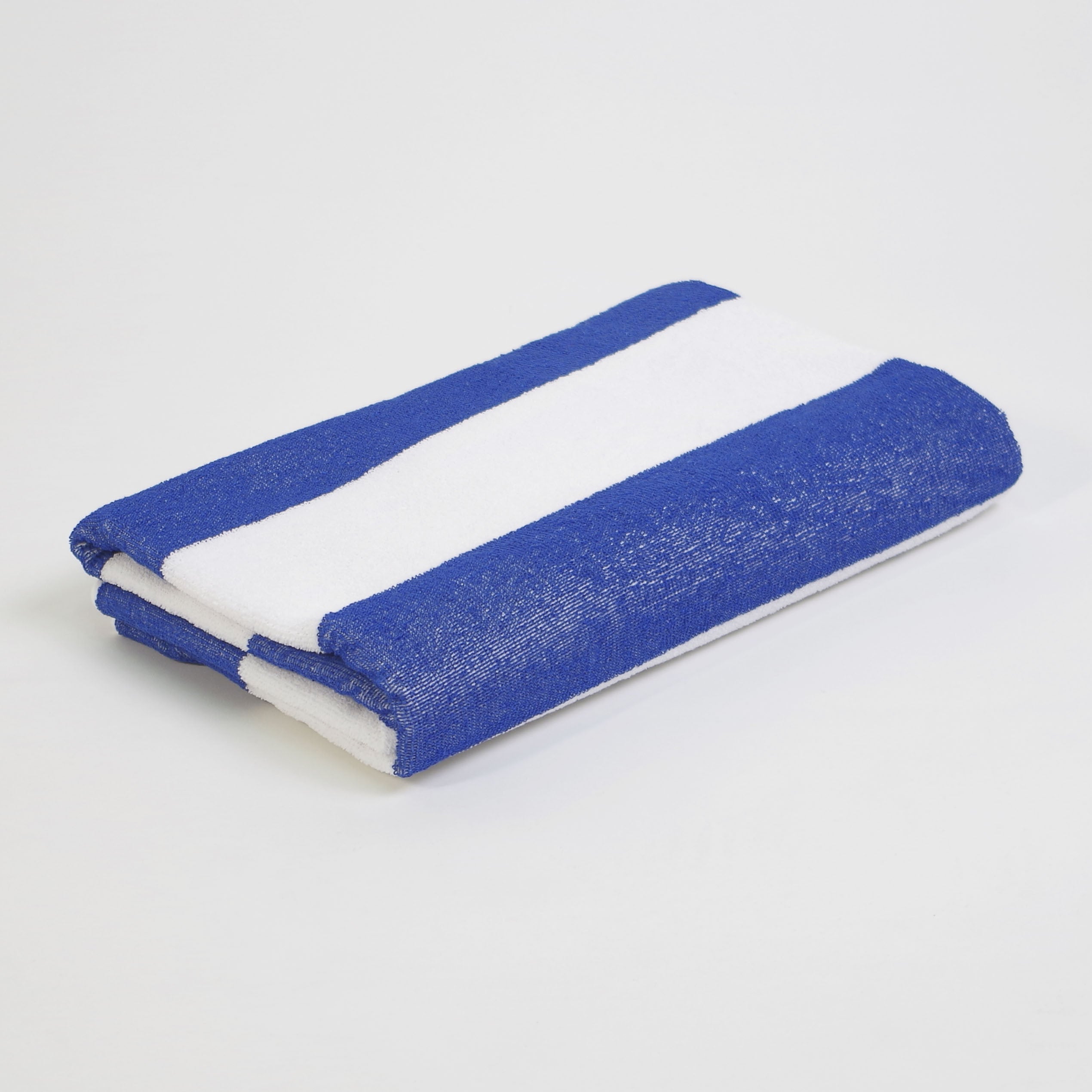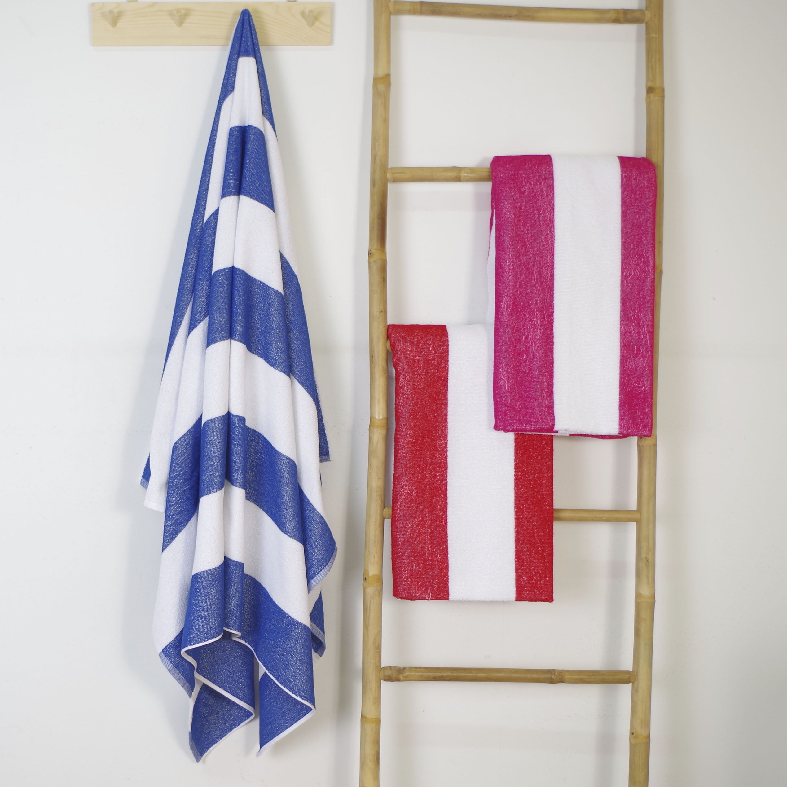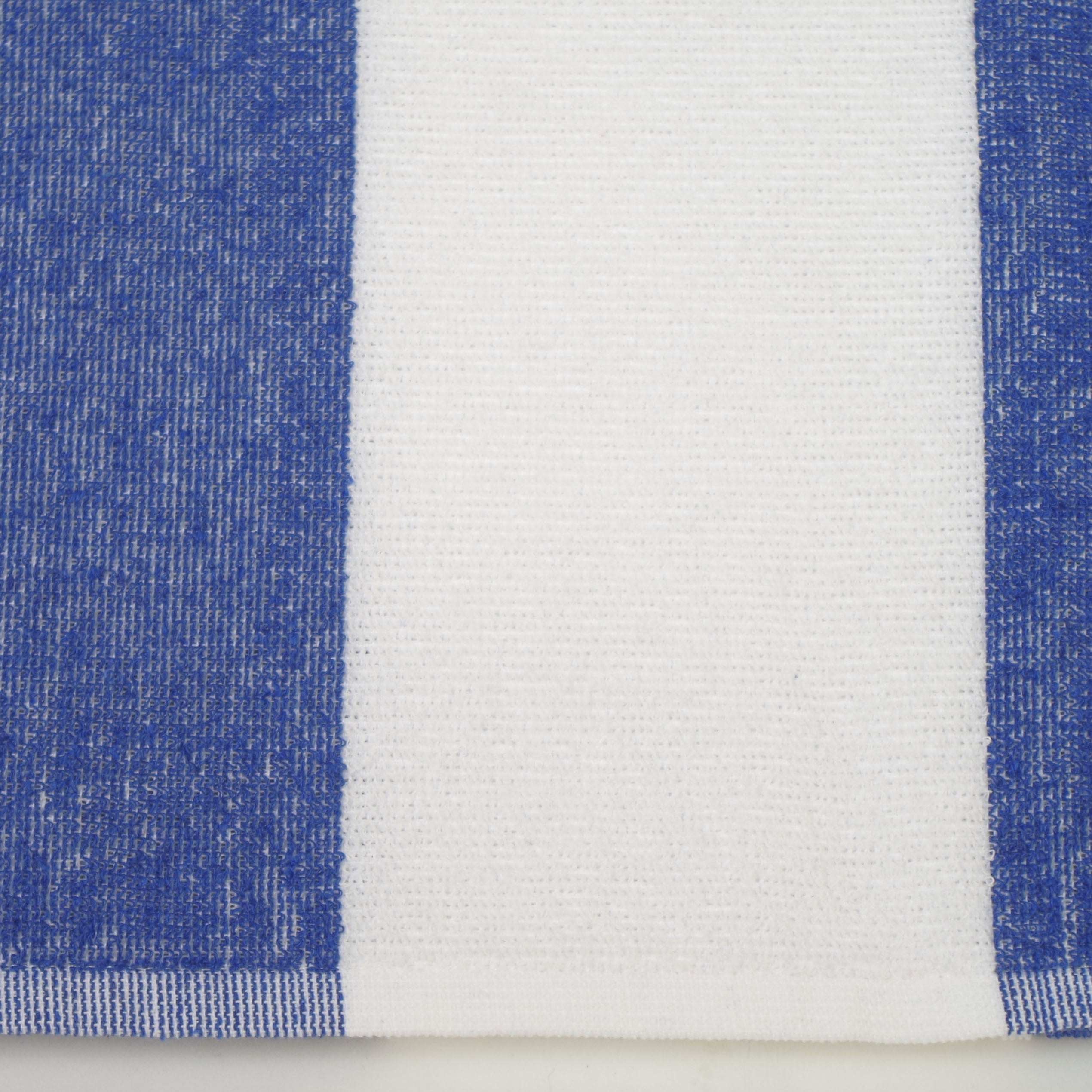Serviettes de plage en éponge avec des rayures bleues et blanches.