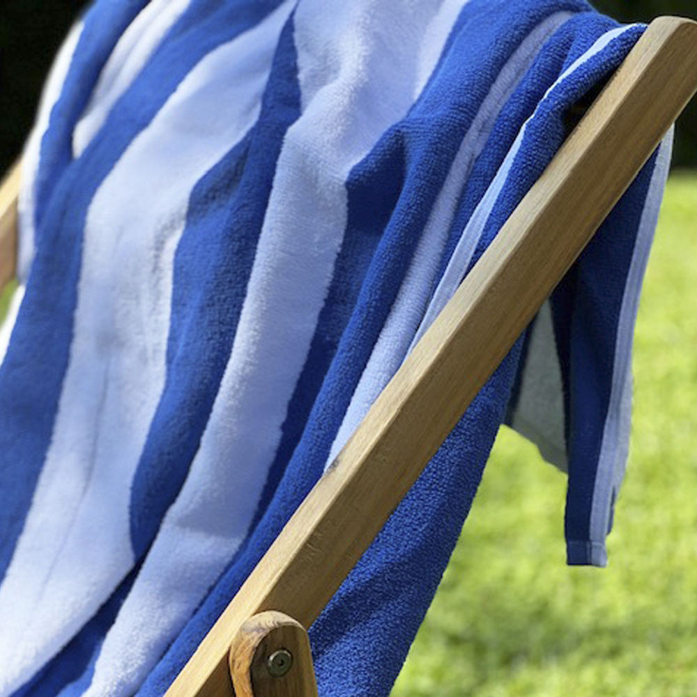Serviettes de plage en éponge avec des rayures bleu foncé et blanc.